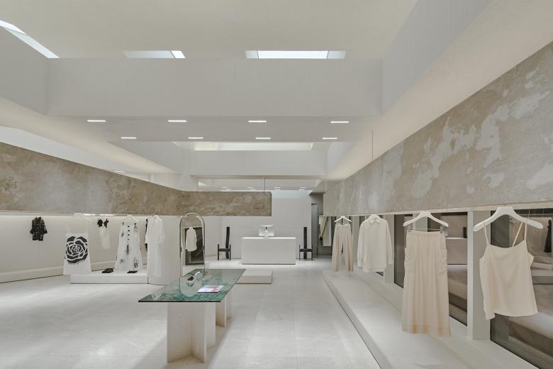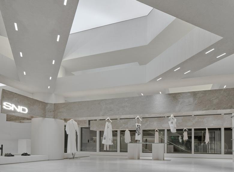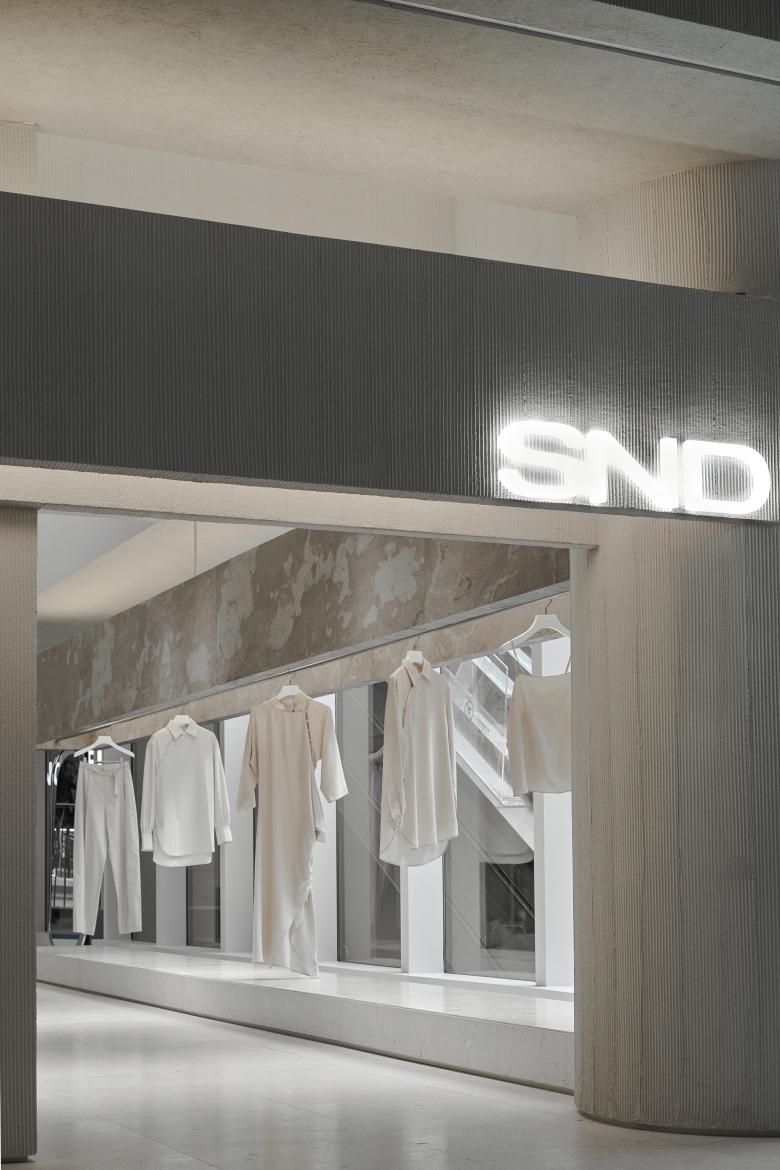 Occupying about 136 square meters, the site is cramped for a boutique fashion store that introduces products from several hundreds of brands. The ceiling height of the original space was relatively favorable. The store needs to be open to the shopping center inside and the windows facing the outside. Based on the site's conditions, Various Associates intended to create a space featuring a sense of layering, architecture and artistry, to continue the genes of other stores they conceived for SND. For that purpose, the design team created several layers of suspended beams in the space, which was inspired by the weathered rough textures and broken aesthetics of ancient temples in deserts. The simple but powerful structural relations on horizontal and vertical levels ensure the transparency of the space, and also strength its sense of depth and the priority system for commodities display.