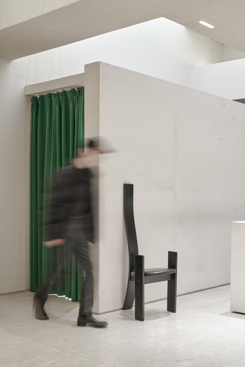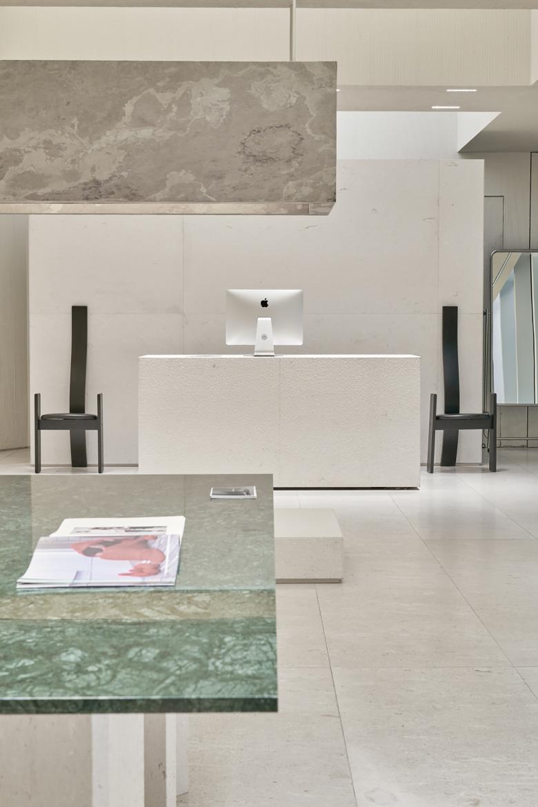 An orderly sense of layering runs through the overall place. Layered structures at different heights guide people's sight lines to provide a comfortable visual experience, and meanwhile turn the originally complicated ceiling system laid with electrical and mechanical pipelines into a feature and highlight of the space. The smooth green stone panels in low saturation forms a subtle balance with the rough pale walls and beams, together adding an elegant yet primitive touch to the space.