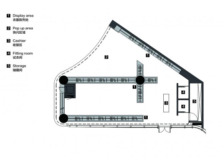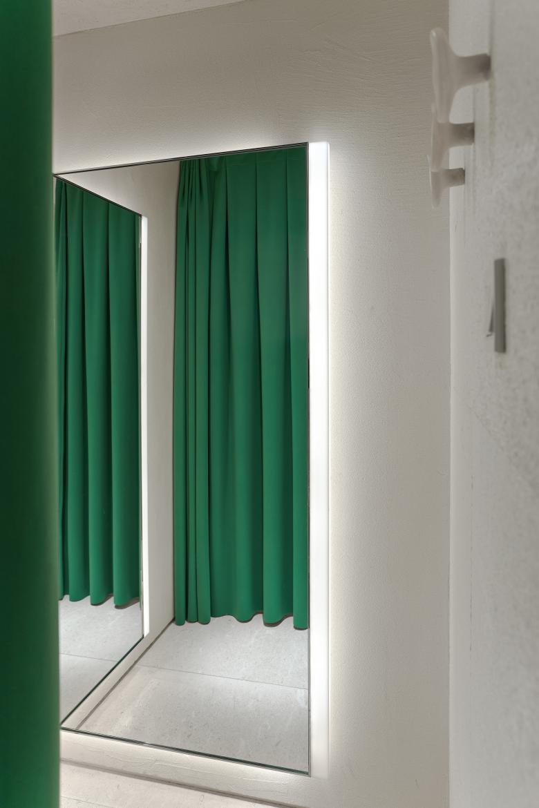 Located behind the cashier's desk, fitting rooms are hung with green curtains, which inject fresh vitality into the space like the plants growing tenaciously in deserts.