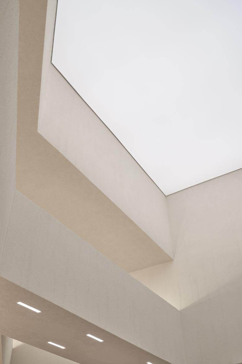 Beams and columns at each layer visually expand the space by fully utilizing height differences. Besides, pipelines and equipment are subtly arranged and hidden in beams and columns, which is a great difficulty of the project. Formal design meets functional requirements, follows a coherent logic, and takes structural aesthetics as expressions, thus producing a space that combines rationality and sensibility. As for the material scheme, rough light-colored textured paint is applied, which recalls the ground paved with beige stones in Europe. In addition, ultra-thin stone veneers of the suspended beams show a textural contrast, and present a solid, rough feeling in soft pale hues.
