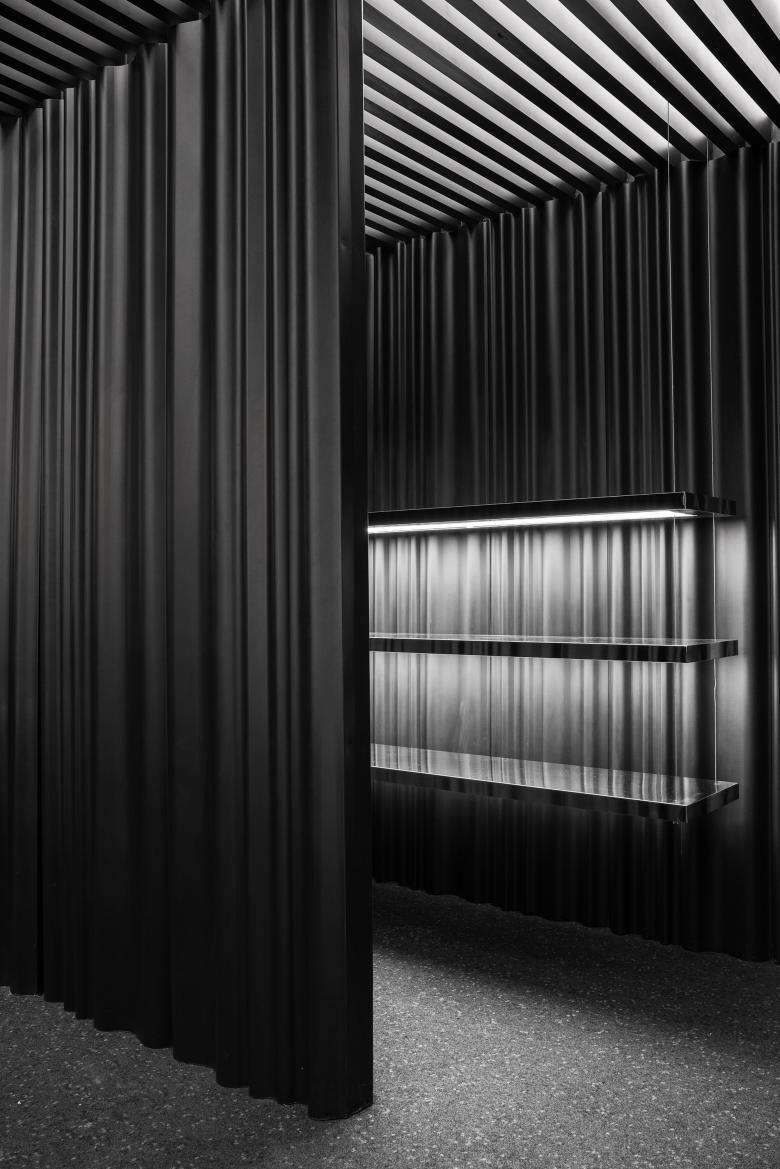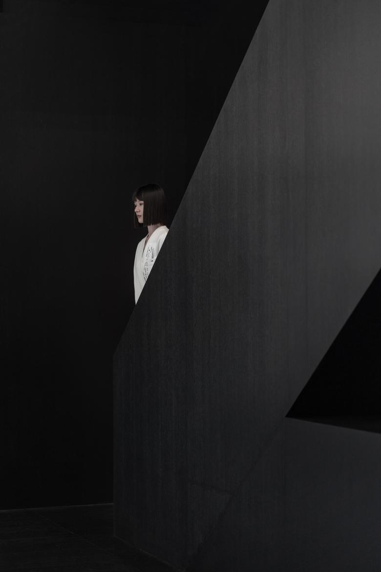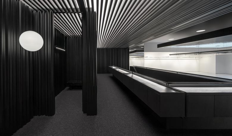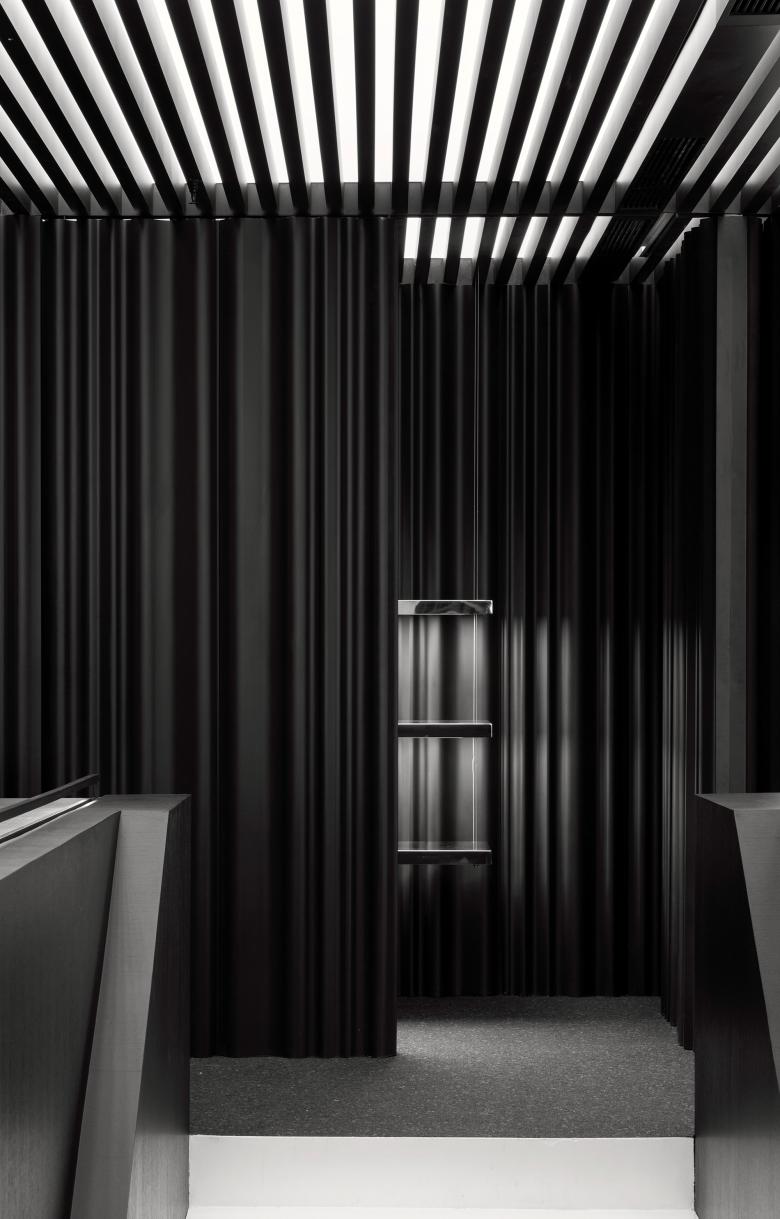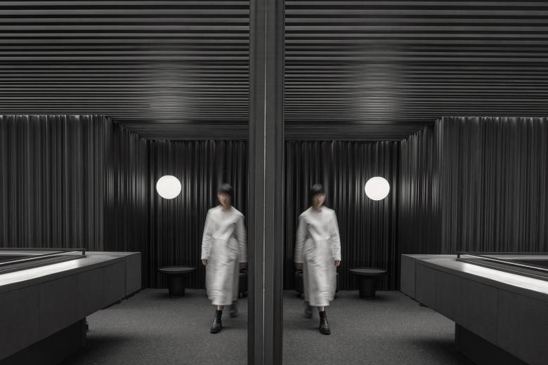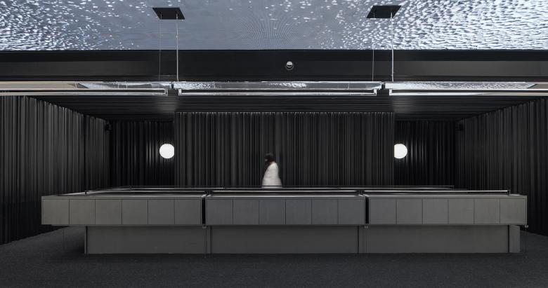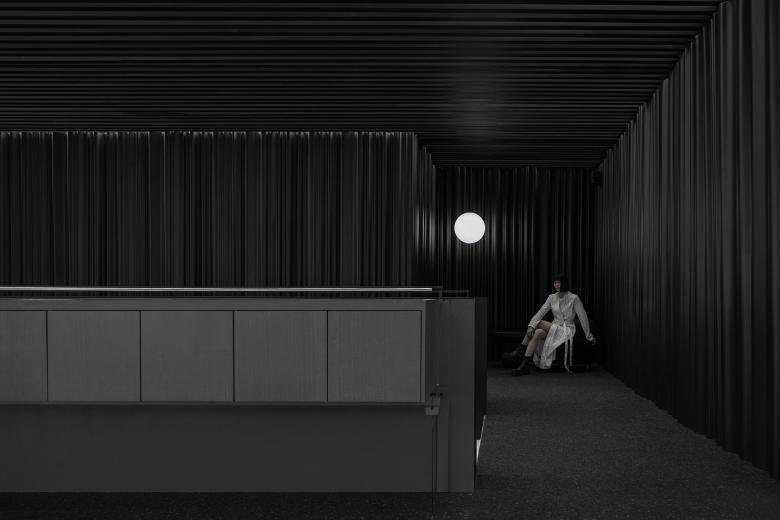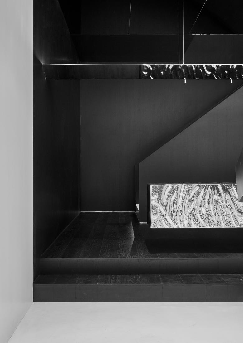 The second floor is a more pure and classy black spatial realm. The design follows the storyline of "Stage", with the wavy black interior surfaces recalling stage curtains.