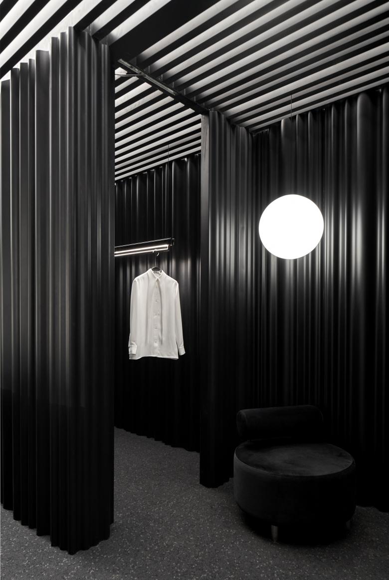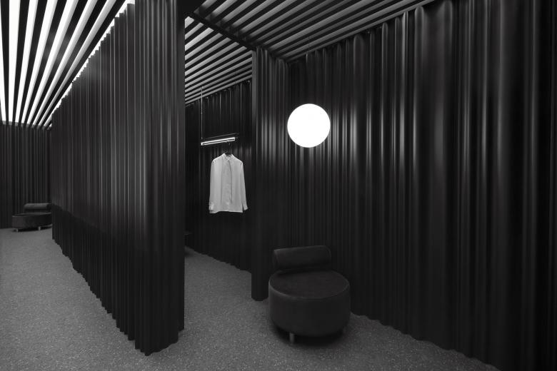 In the corner next to the fitting room curtains, customers can sit on a soft dark gray velvet sofa and wait for their friend or partner to show their outfit.