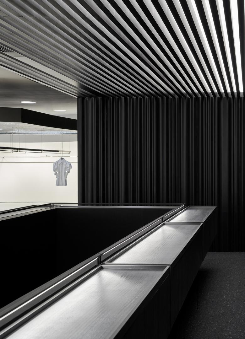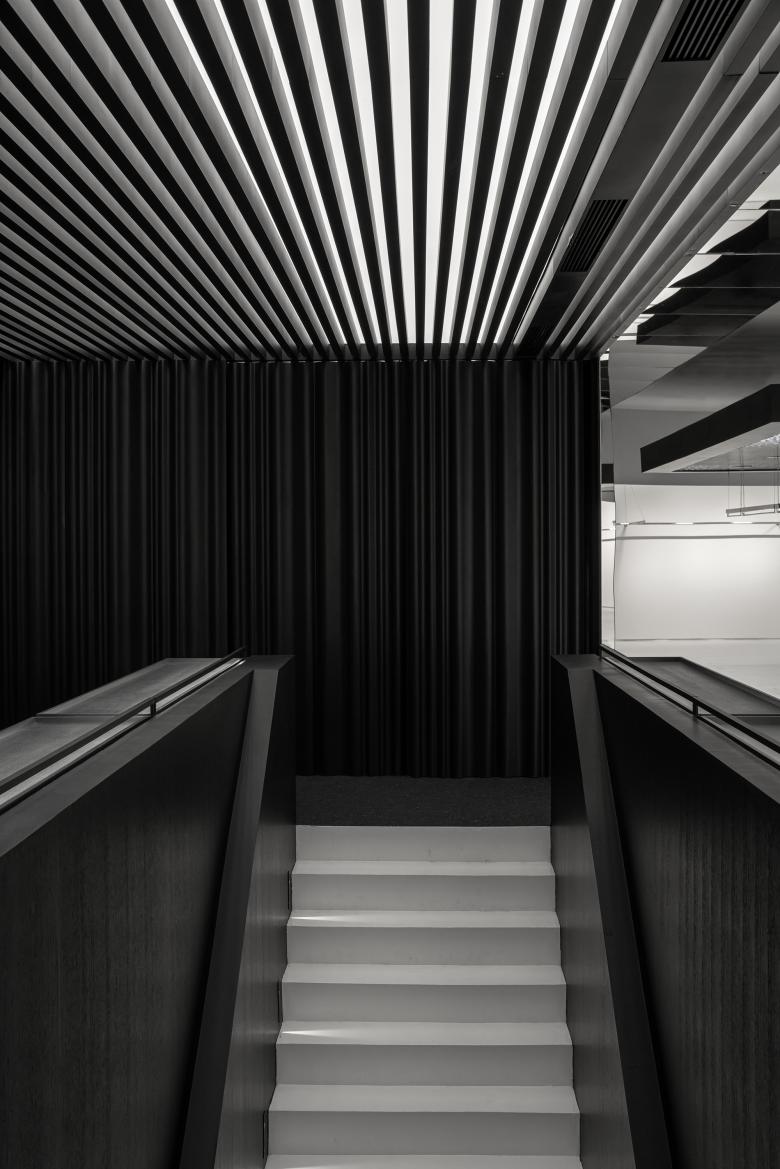 The cool lighting and strip structures on the ceiling reveal the perfect balance between function and atmosphere. The pure white light guides customers to go upstairs in the darkness. The layers and energy of light add noticable charm to the space.