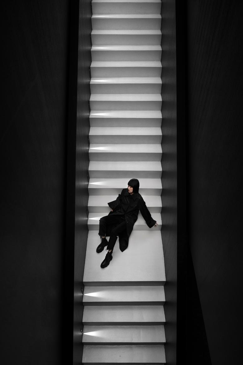 The staircase leading upwards is dominated with black and white, and is characterized by a strong sense of layering and a dramatic contrast of brightness and darkness.