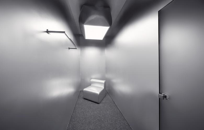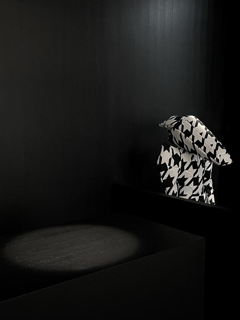 The geometric forms are complemented by black and white hues. The mirrored black area generates a multilayer space with illusionary reflections, producing a breathing and dramatic spatial experience.