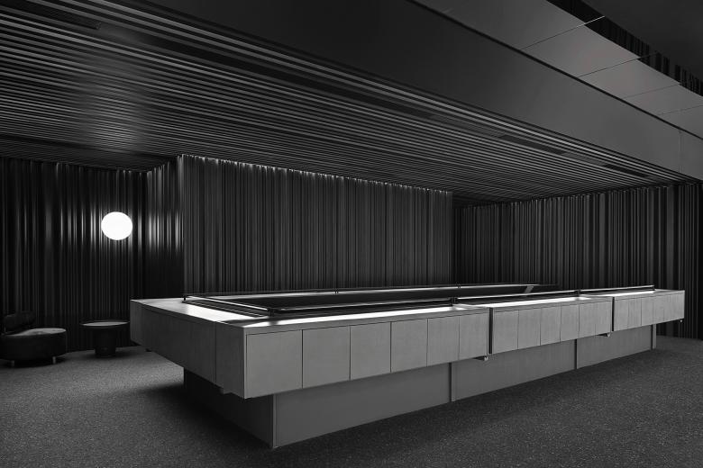 At the multi-functional accessory counter area, the wavy panels can be opened and closed freely like stage curtains, hence allowing the space to flexibly shift between different functions such as accessory display and storage.
