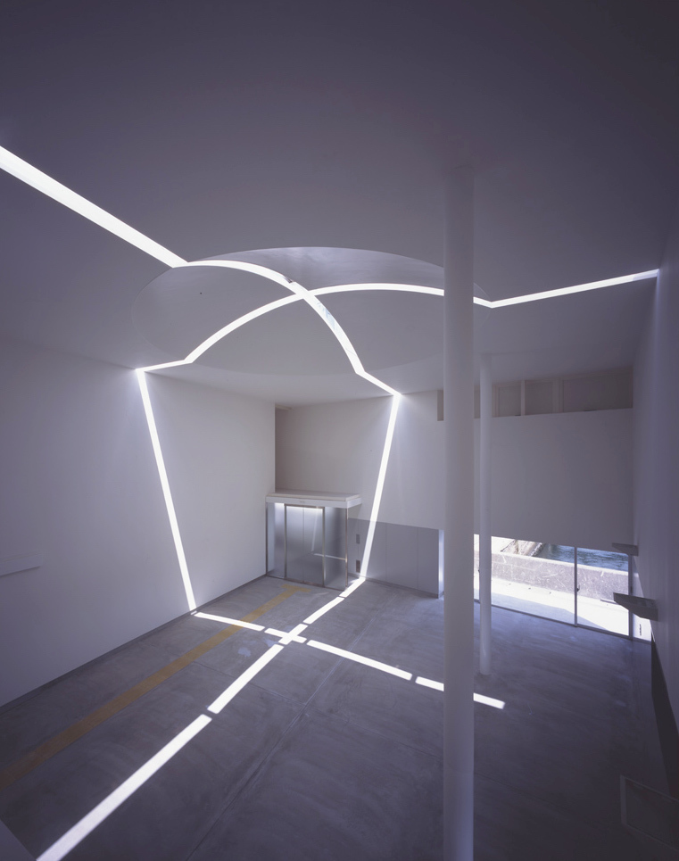 待合ホールの空間はこの建築の最も主要な部分であり、<明石・子午線・天文台>という与条件を空間化しようと試みた。単純な、閉じた箱である建物には二種類の開口だけがある。一つはいうまでもなく、建物の軸とずれてはいるが、正確に南北軸を表示するよう穿たれた天井の十字形のスリットであり、入ってくる光は日時計として時を刻むと同時に、天井の微かなドーム状の形態と共に、この場所が子午線上にあることを表象している。天井をドーム状としたのは、床や壁に落ちる光がきれいな十字形ではなくノイズのある歪んだものとしたかったためでもあり、それは光が十字架のように象徴的過ぎる形態となるのではなく、あくまでも日時計としてあって欲しいと考えたからだ。