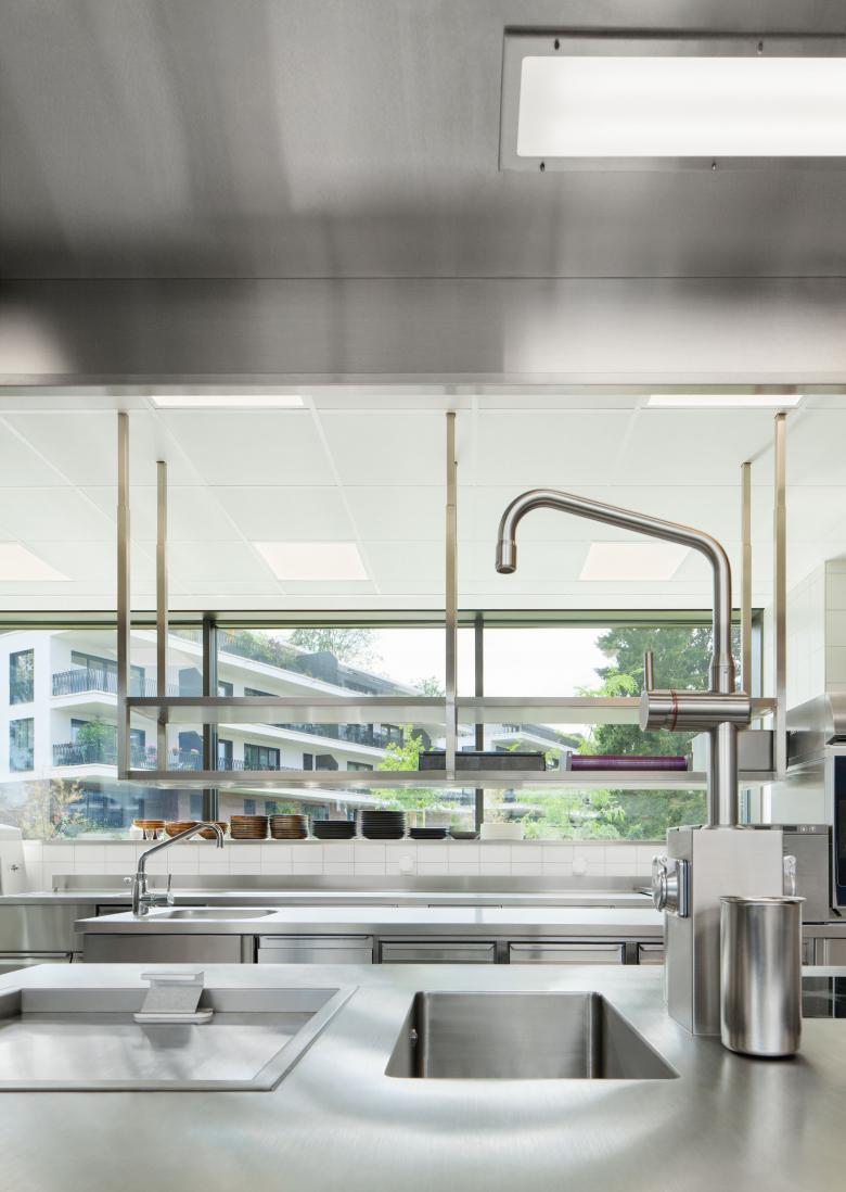 In einem neu konzipierten Glaskubus-Anbau befindet sich das Herzstück der Gastronomie – die Gastroküche. Im Erdgeschoss sind ein grosszügiger Eingangsbereich, Bar, Restaurant für 46 Personen, Bankettraum für 40 Personen mit Nebenräumen angelegt.