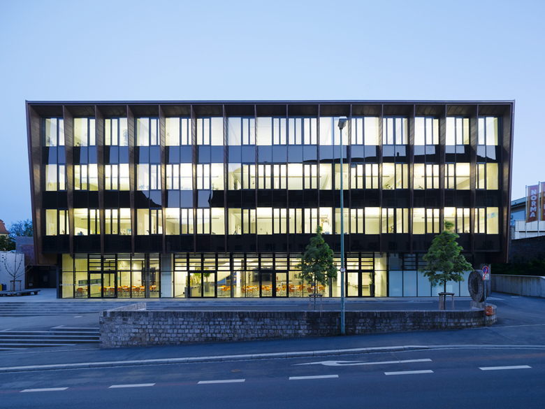 Mit dem Erweiterungsbau des Gymnasiums von 1975 konnte der Straßenraum wieder gefasst und ein Auftakt für die barocke Würzburger Altstadt markiert werden. Die Form des Baukörpers nimmt geometrische Bezüge zur Nachbarbebauung auf. In örtlicher Bautradition findet Kupfer, neu interpretiert, seinen zeitgemäßen Einsatz und wird zum stilbildenden Element. Der Neubau wendet sich mit einer offenen Geste zum Altbau, so dass der zentrale Pausenhof zu einem feiräumlichen Bindeglied wird. Die verglaste Treppenhalle bringt Licht bis in das Erdgeschoss. Durch die einhüftige Orientierung entstehen helle Erschließungsbereiche mit Ausblicken zur Stadt und zur Marienburg.
