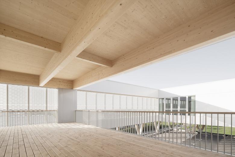 Die Trennung und Stapelung der einzelnen Funktionsebenen sowie die Nutzung der Hanglage des Grundstücks gehören zum wesentlichen Entwurfskonzept. Dadurch konnte die versiegelte Grundfläche minimiert werden, zudem bettet sich der Baukörper harmonisch in die Topografie ein. Der in den Hang eingefügte massive Sockel öffnet sich nach Norden zur Straße. Darin befinden sich die Halle für die Löschfahrzeuge, alle für den Einsatz notwendigen Funktionen sowie Lager- und Technikflächen. Das offene Zwischengeschoss verfügt über zwei Lichthöfe und nimmt die umgebende Landschaft auf. Es ist über eine außenliegende Rampe erreichbar und dient als Parkierungsebene und Übungsfläche für Ausbildungszwecke. In dem darüber aufgeständerten Holzbaukörper sind ein Schulungsraum, Büroflächen und weitere Gemeinschaftsräume angeordnet. Dieser wird von einer homogenen weißen Streckmetallfassade umhüllt. Nach außen hin ist die Stapelung der unterschiedlichen Nutzungsbereiche klar erkennbar, was ein charakteristisches und identitätsstiftendes Erscheinungsbild erzeugt.