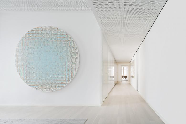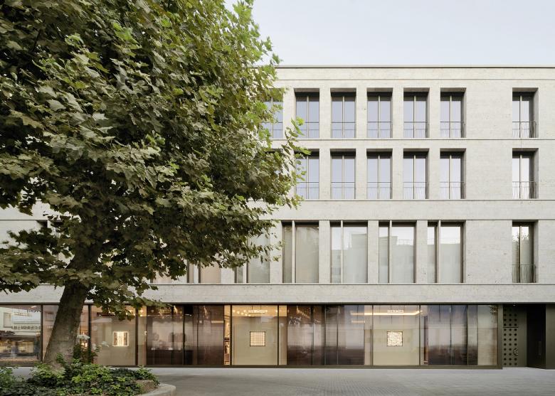 Mit der Fassade aus Mooser Muschelkalk wurde ein typisches Material aus der Region übernommen. Ein grober Kratzschliff verleiht dem Stein einen helleren Farbton, so ist er deutlich als Naturstein zu identifizieren. Die Fassade des Neubaus ist plastisch ausgebildet und fein strukturiert, um die charakteristische Architektursprache der Fünfzigerjahre aufzunehmen. Das von Karl Gonser 1956 fertiggestellte Gebäude »König von England«, das sich in räumlicher Nähe befindet, ist ebenfalls eine wichtige Referenz. Zugleich zeigt sich der Neubau als klar gestalteter Kubus, der deutlich in der zeitgenössischen Architektur verortet ist.