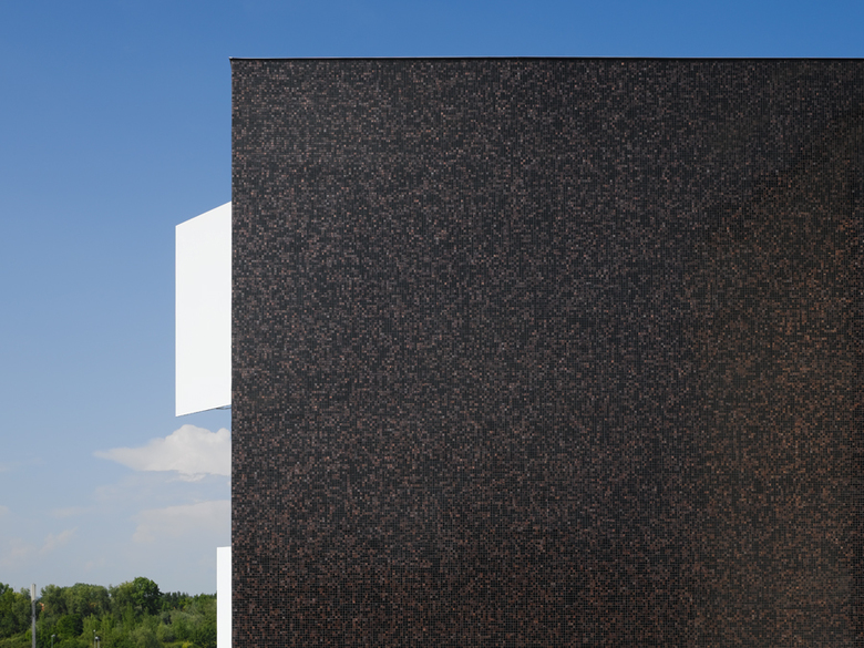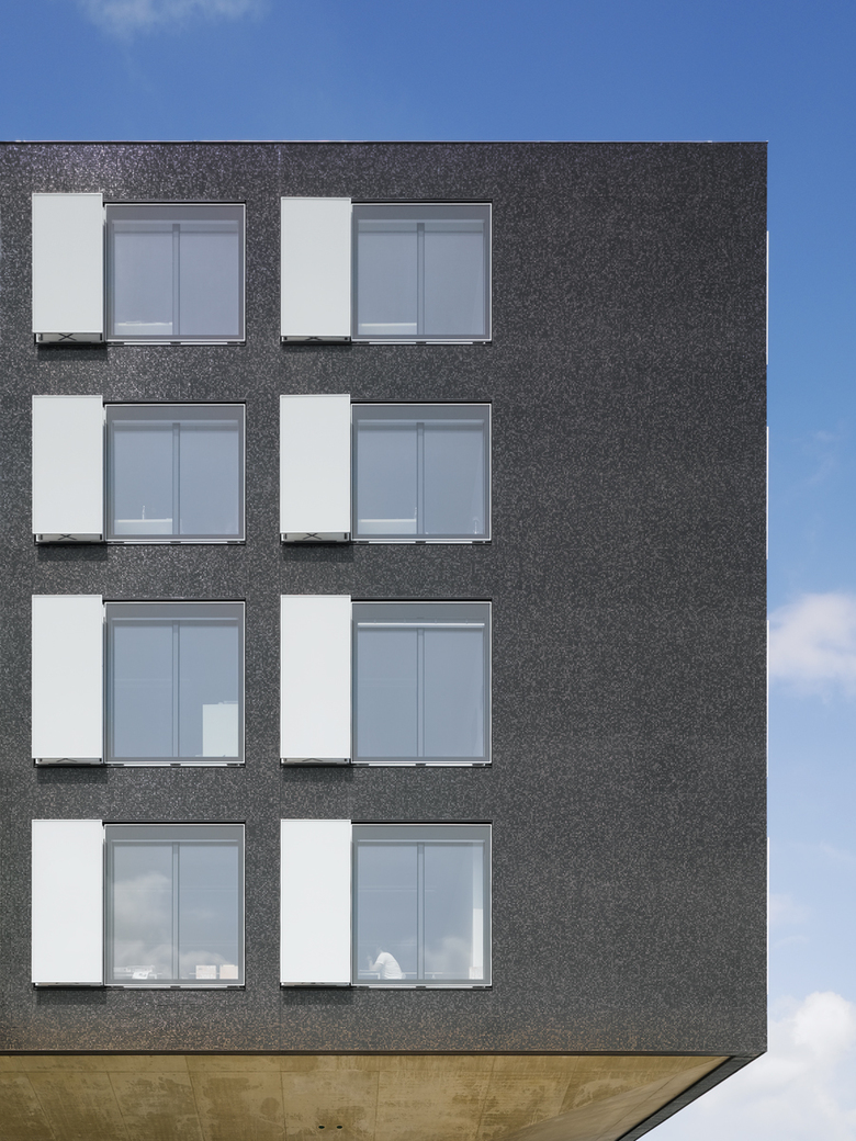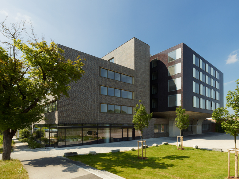 Werkstätten und Internatsbereich aus den 70er-Jahren wurden umgestaltet und durch einen Neubau mit Unterrichtsräumen, Büros und zusätzlichen Internatsräumen erweitert. Das zentrale Treppenhaus verbindet die vier Geschosse des Altbaus mit dem neuen Kubus, der über dem eingeschossigen Werkstattbereich zu schweben scheint. Da der Altbau keine weiteren Lasten aufnehmen konnte, tragen vier Stützen einen plastisch ausgebildeten, sogenannten Tisch mit den neuen Obergeschossen. Eine Glasmosaikfassade bildet die Gebäudehülle, deren unterschiedliche Brauntöne mit den weißen Fensterelementen kontrastieren. Diese übertragen die „hygienisch“ weißen Innenräume auf das äußere Erscheinungsbild. Der Neubauwürfel wird seiner exponierten Lage als zeichenhaftes Bauvolumen gerecht und hebt sich aus dem heterogenen städtebaulichen Umfeld ab.