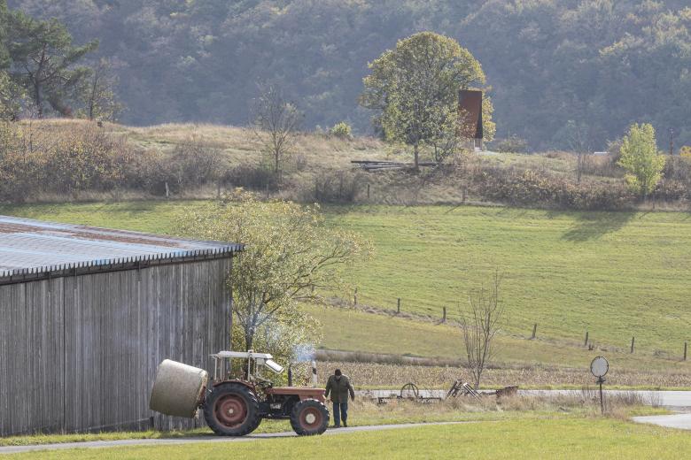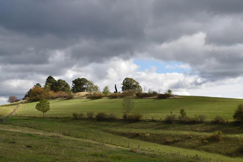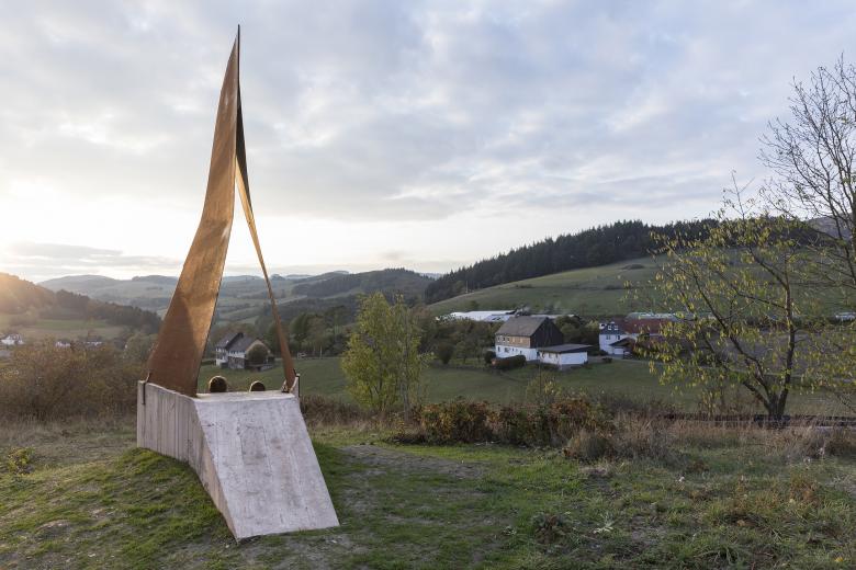 Auf dem Osterfeuerhügel oberhalb von Referinghausen thront der Sonnenklang Open Mind Place. Das zeltförmige Dach über einer Holzliege fängt die Lichtstrahlen der Abendsonne und die Klänge der Umgebung ein. Hier kann sich der Besucher ausruhen und die Landschaft in sich aufnehmen.