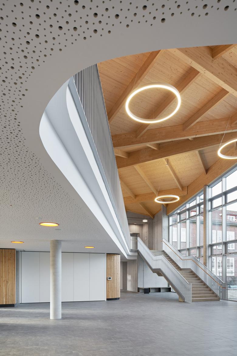 Die Eider-Nordsee-Schule Wesselburen entstand als Erweiterungsneubau unter Einbeziehung des heterogenen Gebäudebestandes am Standort der Friedrich-Hebbel-Schule. Durch die zentrale Positionierung des Neubaus und des Vorplatzes ergibt sich eine klare räumliche Neuordnung des Schulareals, dessen Mitte von der zweigeschossigen Aula mit Mensa gebildet wird. Diese verbindet den Erweiterungsneubau direkt mit dem zu sanierenden denkmalgeschützten Gebäude von 1951. Die zurückhaltende Materialsprache der Fassade aus Holz und Stein prägt gemeinsam mit dem gefalteten Dach, dessen Hochpunkte sich an den innenräumlichen Freilernzonen orientieren, das äußere Erscheinungsbild des Neubaus.