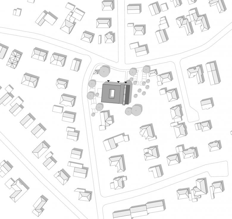 Das neue Kirchenzentrum in Kl. Offenseth-Sparrieshoop soll sich stärker und prägender als bisher im Dorfbild darstellen und eine räumliche Mitte generieren. Dafür werden vertraute, archetypische Bilder und Motive, Formen und Materialien verwendet, die jedoch durch eine Überhöhung ins Markante das Kirchenzentrum auf dem profanen Kontext des Umfeldes hervorheben. Als Gebäudeensemble bildet das Kirchenzentrum räumlich einen „Kirchplatz“ als Eingangsbereich. Formal, materiell und ästhetisch bilden Kirche, Gemeindehaus und KiTa ein Gebäudeensemble, das sich aus dem typologischen Grundmuster des Klosters ableitet und eine Haltung der Bescheidenheit postuliert. Der einschiffige Kirchenraum bietet 150 Plätze und lässt sich zum Gemeindesaal hin durch große Flügeltüren erweitern. Die Räume des Gemeindehauses und der Kita gruppieren sich um den Innenhof.