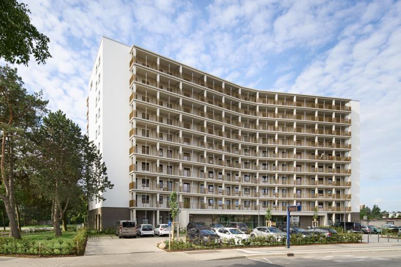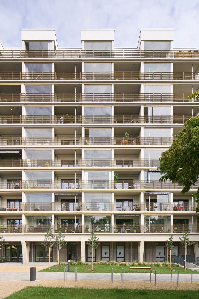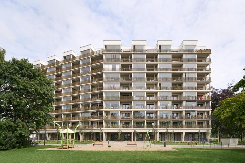 Die Architektur beschränkt sich auf das funktional und konstruktiv Notwendige. Durch ausgewogene Proportionen, Wiederholung, Präzision und charaktervolle Materialien wird eine hochwertige Gestaltung geschaffen. Das Wohnhochhaus hat eine Verwandlung erfahren: Von einer anonymen Gestalt zu einer klaren und zeitgemäßen Formensprache voller Leichtigkeit.