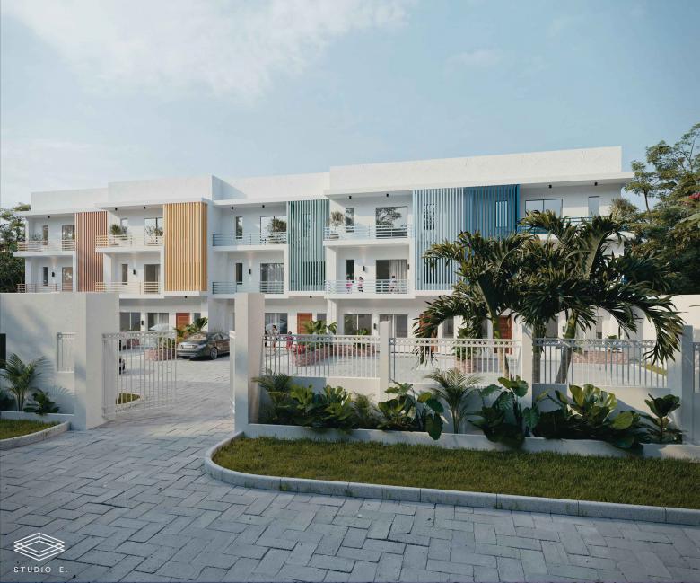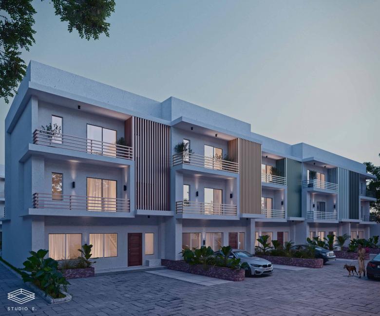 The Etete Terrace Development comprises eight three-story terrace houses situated on a 2540m2 expansive property. Each four-bedroom residence boasts a building footprint of 80m2, featuring a ground floor with a living and dining area, kitchen, and staff room, while the first and second floors house two bedrooms each along with a shared living area.