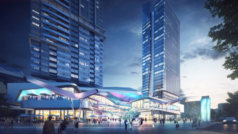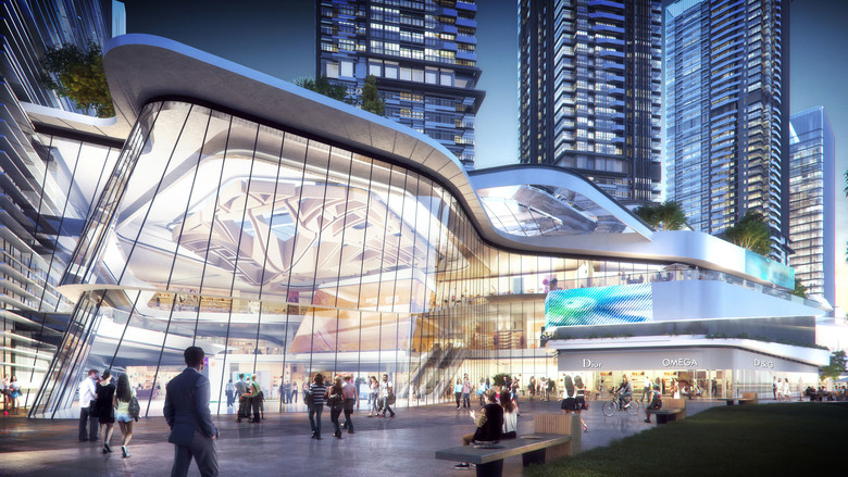 Ted Givens, Design Partner at 10 DESIGN explained: “A serpentine bridge floats across the three sites, unifying the geometry. The bridge is composed of a series of organic canopies that create a dynamic skyline, and help draw people to the upper floors of the F&B retail. The bridge bends down to the ground on the far ends of the site further enhancing connectivity and creating an arc across the main façade.”