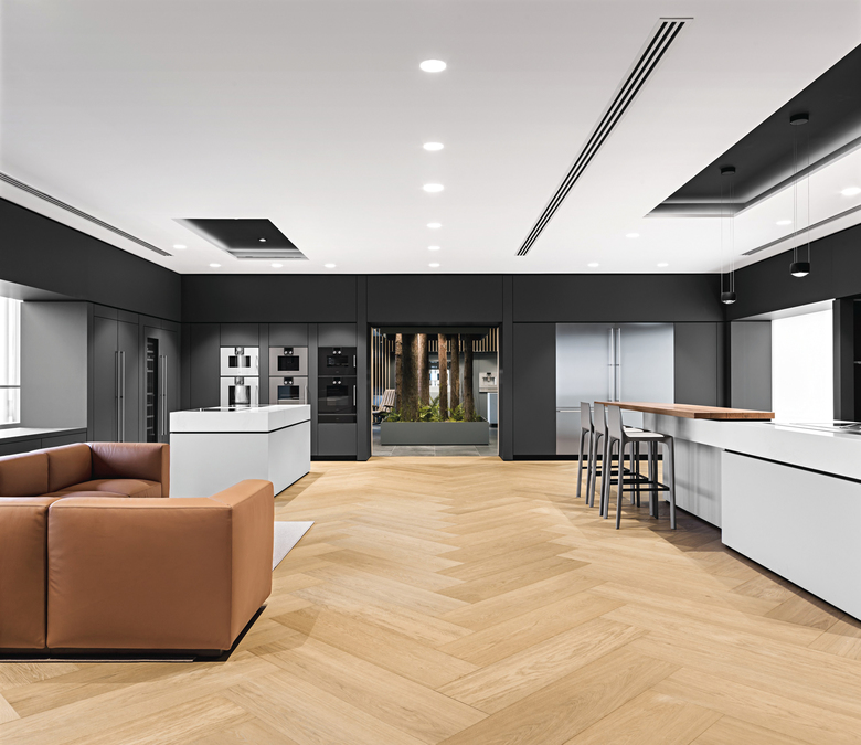 Included within the showroom’s layout is a lifestyle area, where the design concept and approach have been stripped back to reveal a pure, clean aesthetic, often reflected in the product design of Gaggenau appliances. This approach has been carried through to the wine room, which houses a selection of fine wine bottles, encased and beautifully displayed, in Gaggenau Vario wine climate cabinets.