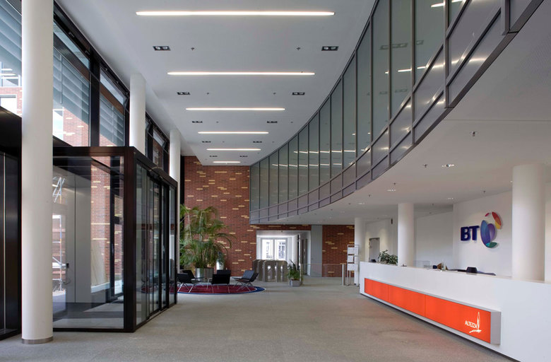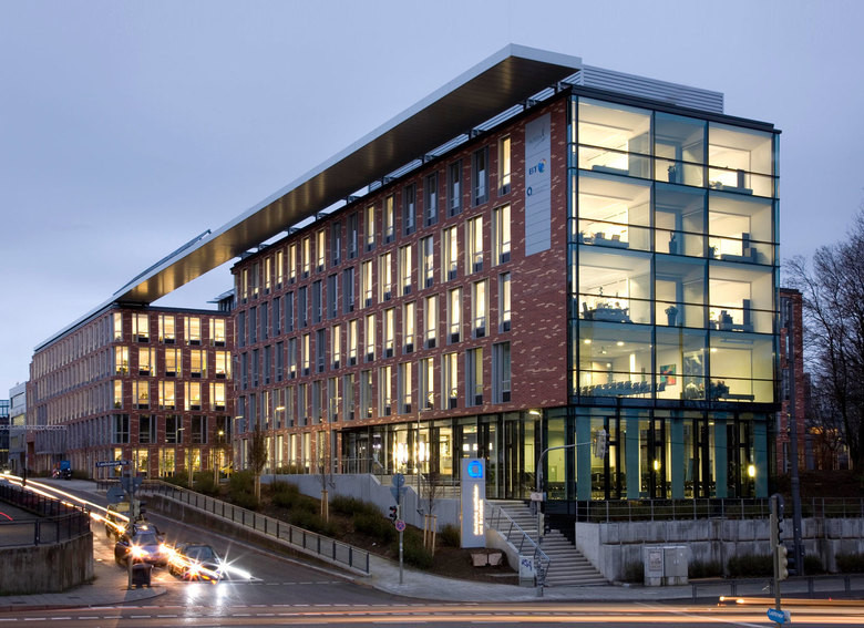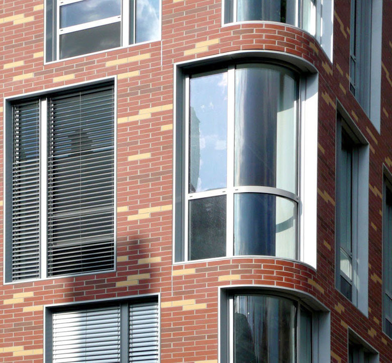 Ziegelfassade – Konstruktion – Die Ziegelfassade ist eine hinterlüftete Konstruktion, bestehend aus Dämmung, Hinterlüftung und massivem Ziegelsteinen. Die Klinkersteine sind in einem Sonderformat projektbezogen hergestellt, angepasst an das Gebäuderaster, bzw. Ausbauraster. Sonderformsteine gibt es auch an der „runden Ecke“. Befestigt sind die Klinkersteine am Stahlbeton-Rohbau mit Edelstahlankern. Die Fassaden-Entwässerung verläuft in der Ebene der Hinterlüftung. Die Fassade wurde vor Ort aufgemauert. Die Ziegelsteine wurden in drei verschiedenen Farben gemischt, einem Grundton mit einem helleren und einem dunkleren Stein. Zur Sicherstellung einer gleichmäßigen Farbstruktur wurde die Lage jedes Steins im Plan festgelegt. Die hochwertige Gebäudehülle führt in Kombination mit der Nutzung von Fernwärme zum Heizen und Grundwasser zum Kühlen zu einem Primärenergieverbrauch, der über 40 % unter den Anforderungen der ENEV2007 liegt.
