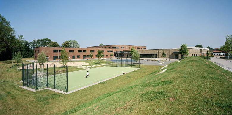 Der Neubau ist durch zwei L-förmige Baukörper geprägt, die vier unterschiedlich gestaltete Höfe entstehen lassen. Diese bieten Raum für verschiedene Nutzungen und verleihen der Schule eine klare, von außen erkennbare Struktur, die durch die Materialwahl und Farbgebung verstärkt wird.