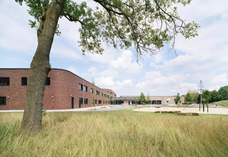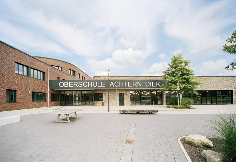 Der Neubau der Oberschule Achtern Diek in Dorum öffnet sich mit dem Fachraumtrakt und dem Verwaltungsflügel zur Alsumer Straße und schafft einen großzügigen, offenen Schulhof, der sich gut überblicken lässt. Gleichzeitig bildet der an einen Deich erinnernde Erdbaukörper am westlichen Rand des Schulhofes einen Schutz zur Straße hin und grenzt das Schulgelände von der Umgebung ab. Die Schüler:innen können so in ihren Pausen ungestört mit der Offenheit, Luftigkeit und Vielfalt des Schulhofes in Kontakt treten.