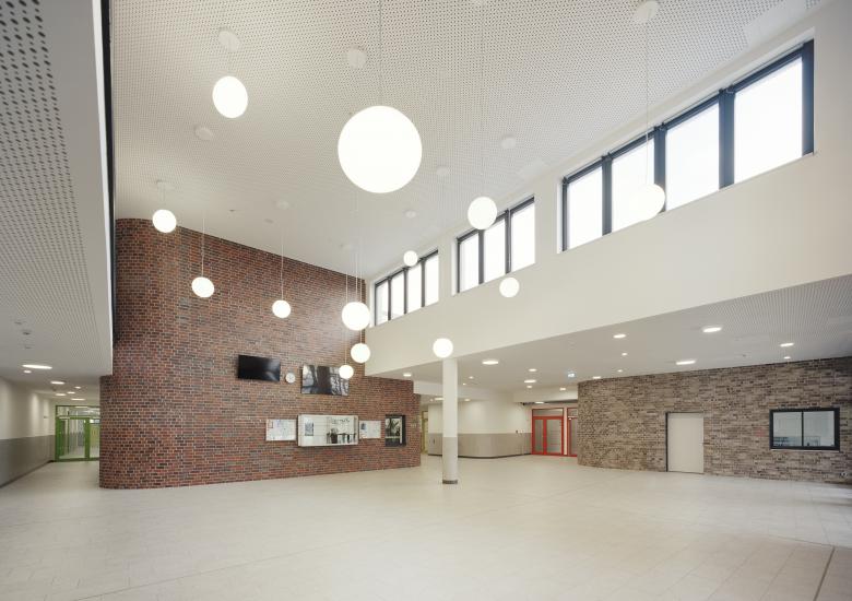 Der zentrale Eingangsbereich führt über einen Windfang in das zweigeschossige Foyer, das als Herz der Schule dient. Hier sind das zentrale Treppenhaus, welches über alle Geschosse zu den Fachtrakten und dem allgemeinen Unterricht führt, die Aula/Pausenhalle und die Fachräume angebunden. Die offene Atmosphäre des Foyers wird durch den Luftraum im Obergeschoss verstärkt, was interessante Blickbeziehungen schafft und den lebendigen Charakter des Schulgebäudes betont. Eine besondere Rolle spielt die Schulbibliothek im dritten Obergeschoss, die an der Kreuzung der beiden Unterrichtstrakte positioniert ist und von außen wie ein Lichtturm wirkt. Die Bibliothek soll mit ihrer Gestaltung zu einem anregenden Lernort werden und für die Schüler:innen gleichzeitig das beruhigende Rückgrat sein, in das alle Funktionen einer modernen Bibliothek integriert sind.