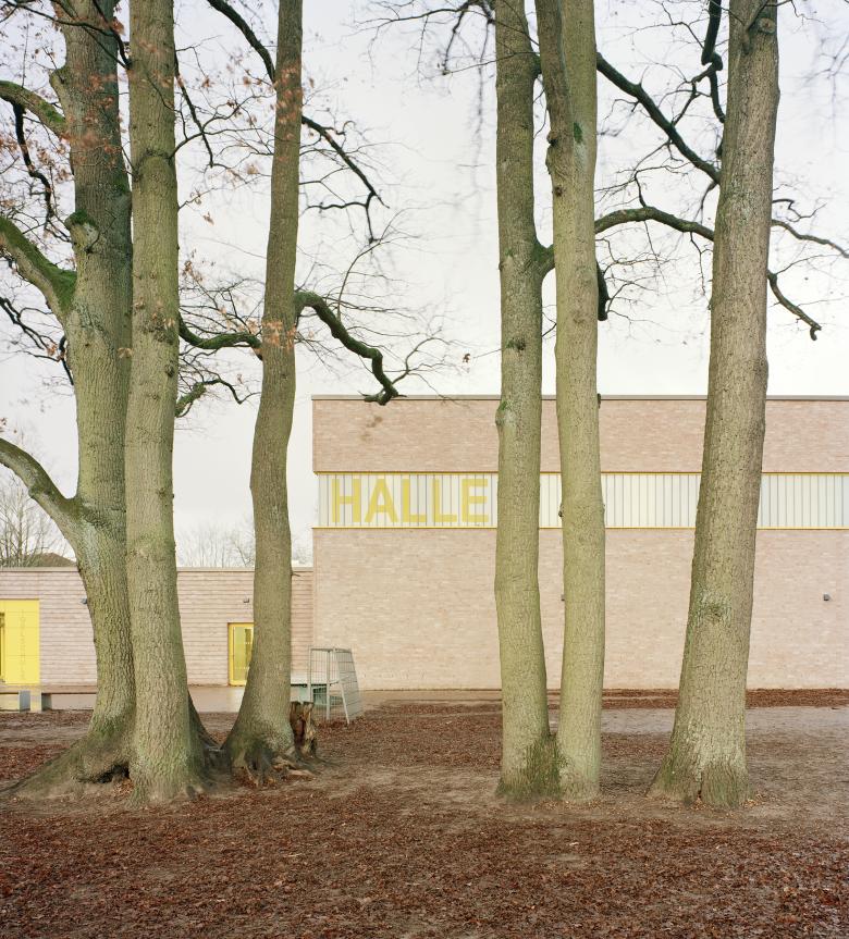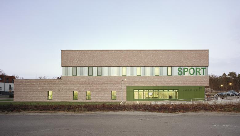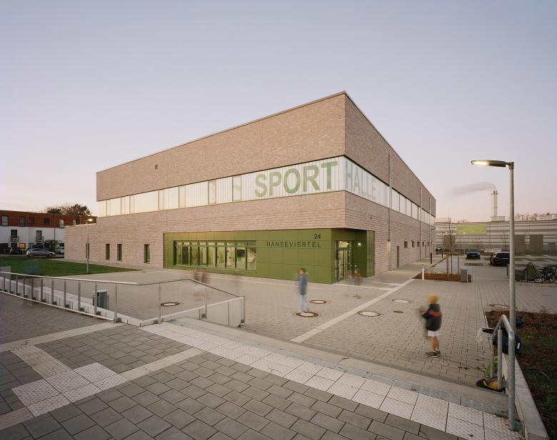 Ein markantes Fassadenkonzept verbindet die Hallen optisch durch umlaufende Fensterbänder und gezielte farbliche Akzentuierungen. Die detaillierte Klinkerfassade mit reliefiertem Sockelbereich unterstreicht die unterschiedlichen Nutzungszonen. Besonders bei der Dreifeldsporthalle im Hanseviertel wird dieses Konzept deutlich sichtbar: Der Baukörper ist klar gegliedert in einen eingeschossigen Sockel für die Nebenräume und ein leicht zurückgesetztes Obergeschoss, das den Hallenteil beherbergt.