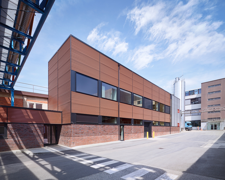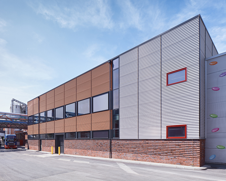 In diesem Fall greift der Erdgeschosssockel die historische Ziegelbauweise im Werk auf. Vorspringende Ziegellagen schaffen ein markantes Fassadenrelief. Im gleichen Farbspektrum überragt die darüberliegende Sandwich-Fassade mit Wellprofilverkleidung das Bestandsgebäude. Als Übergang zu den anschließenden Technikbauten und Silos ist eine Teilfläche aluminiumfarben ausgebildet. Aus Systemfenstern der Sandwichfassade wurden Fensterbänder gebildet, die mit Rahmenprofilen die Fassade zusätzlich profilieren und rhythmisieren. Die Proportion der vertikal wechselnden Materialität von Ziegeln, Glas und Wellblech in der Fassade steigt vom Sockel bis zur Attika abwechselnd mit den Verhältniswerten von 1/1,5 und 1/2 von 1 m bis 3 m an. Ziel dieser Proportionierung ist die Betonung der Gebäudehöhe und Dominanz dieses kleinen Industriebaus.