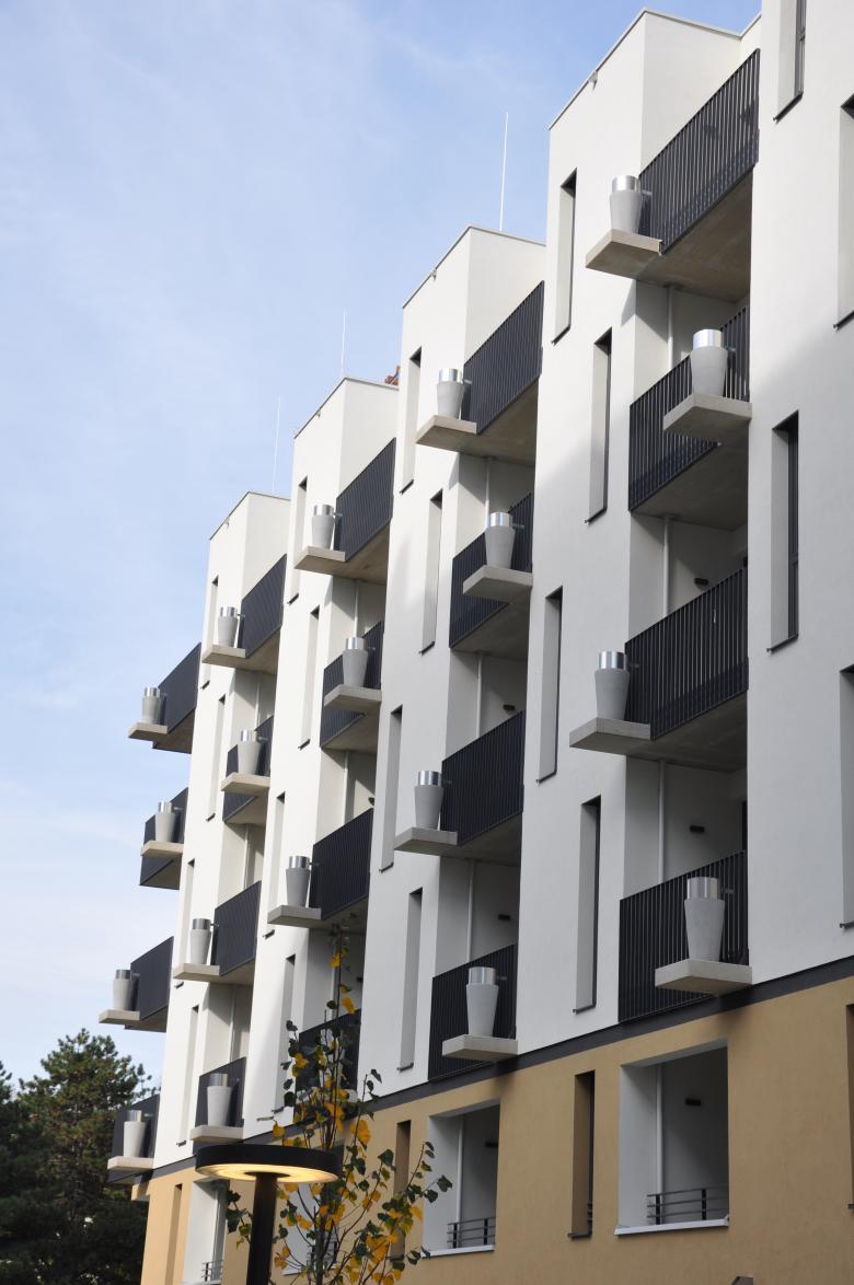 Auf der Liegenschaft des rund 10.000 m2 großen, mittig gelegenen Bauplatzes entstand ein hochqualitatives Wohnquartier mit sechs unterschiedlichen Baukörpern in geschlossener Bauweise und insgesamt 219 Wohneinheiten, wovon 93 als SMART-Wohnungen ausgeführt wurden.