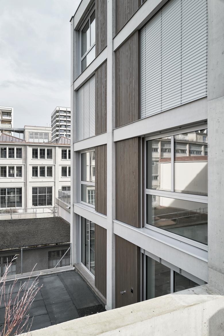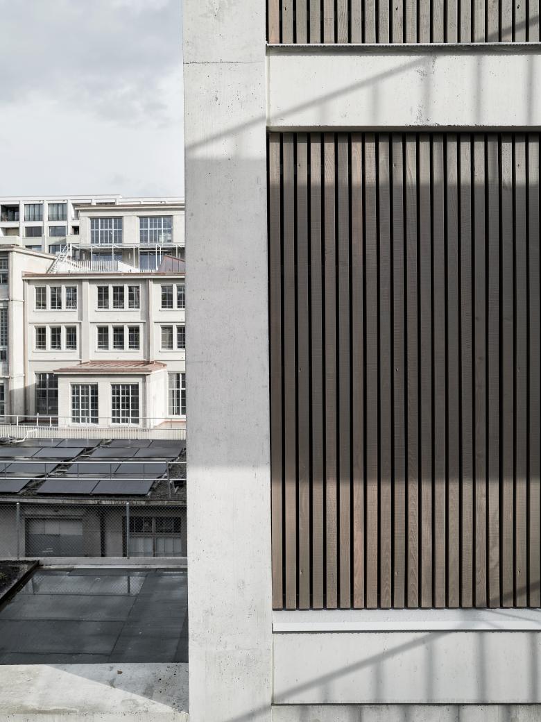Der architektonische und strukturelle Auftritt des Gebäudes orientiert sich wesentlich an den ehemals industriell genutzten, durch die Abbildung ihrer Tagkonstruktion geprägten Gebäuden auf dem Papieri-Areal. Die Tragkonstruktion des Neubaus bildet sich nach Aussen hin in einem steinigen Betonraster ab. Dabei stehen die über alle Geschosse durchlaufenden Stützen den Deckenränder leicht vor. Der daraus entstehende Raster wird mit Füllungen aus Fenstern und Holzelementen versehen. Den jeweiligen Elementen vorgelagert werden geschosshohe vertikalen Holzlamellen angebracht. Teilweise werden ganze Rasterfelder mit festen Holzlamellenelemten den Fenstern im Bereich der Nassräume und dem Treppenhaus vorgelagert. Im Sockelgeschoss werden die Holzelemente in die offene Struktur gehängt, sodass die Parkierung immer natürlich belüftet ist. Die Holzelemente bilden in ihrer dunkelbraunen Erscheinung einen Kontrast zu den an Ort betonierten, hellen Stützen und Deckenränder, sodass sich die konstruktive Rasterstruktur schön herausbildet. Mit den ausspringenden Balkonen und ihren vorgehängten Betonscheiben wird die Privatsphäre der Wohnungen durch den direkten Sichtbezug zur Obermühlestrasse gewährleistet.