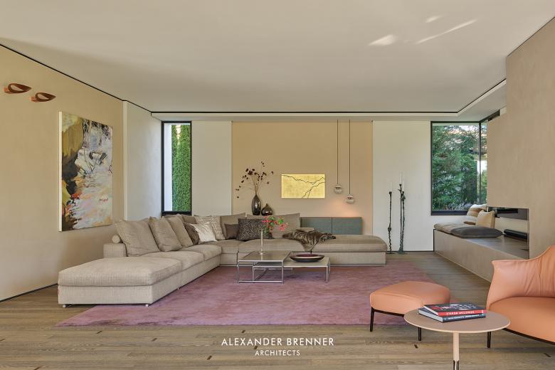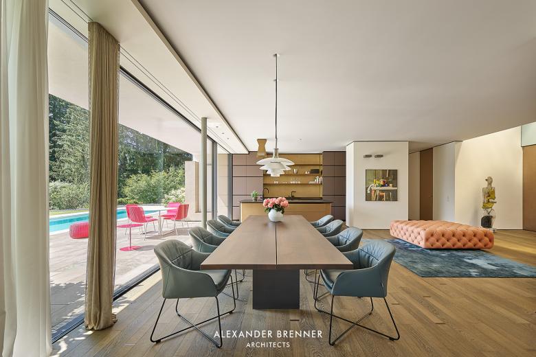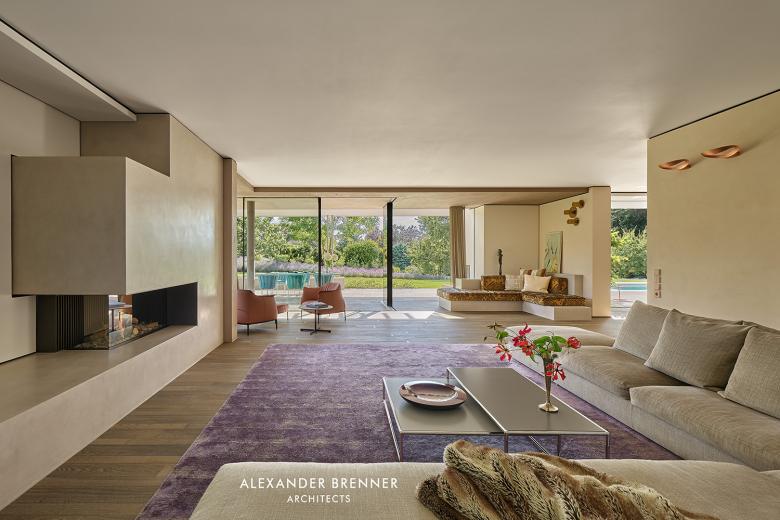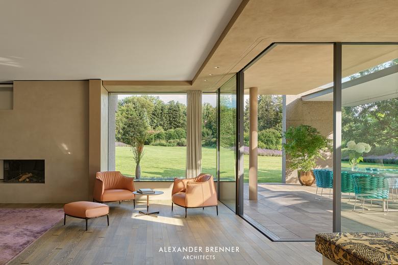 The living level is designed as an open-plan spatial continuum with predominantly floor-to-ceiling glazing facing south west over the landscape garden. The open hall leads to the dining and the kitchen area, which is adjoined by a terrace and a pool facing south-west and to the living area with its fireplace.