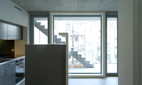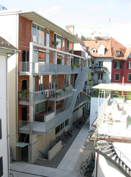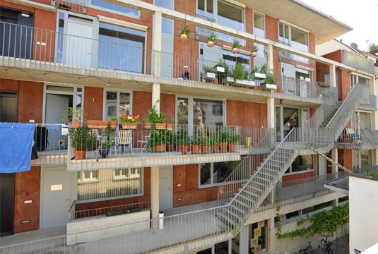 Der Bau ist ganz aus der Wohnvorstellung abgeleitet, die wir zusammen mit der Genossenschaft für diesen Ort mitten in der dichtgebauten Stadt entwickelt haben: Die Wohnungen öffnen sich grosszügig zu Laubengang und Hof und schotten sich zur sehr lärmigen Strasse hin ab. Im Wohnungsinneren werden die zum Hof sich öffnenden Kommunikationsräume durch sichtgeschützte Individualräume ergänzt.