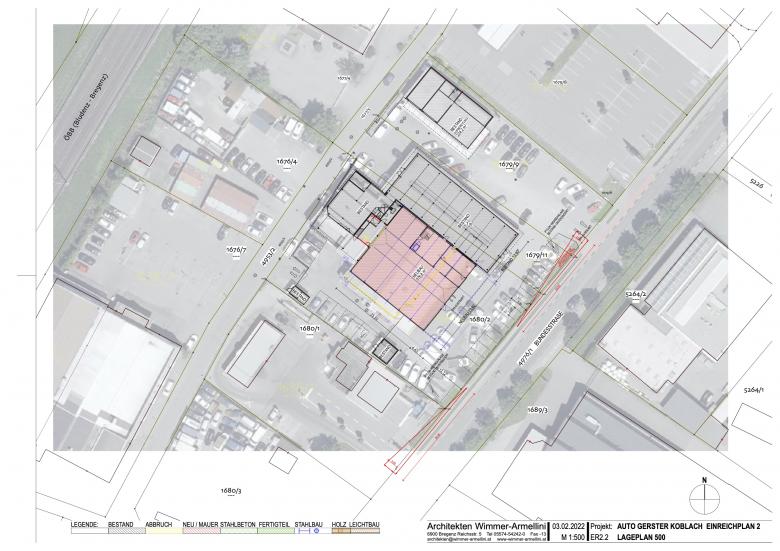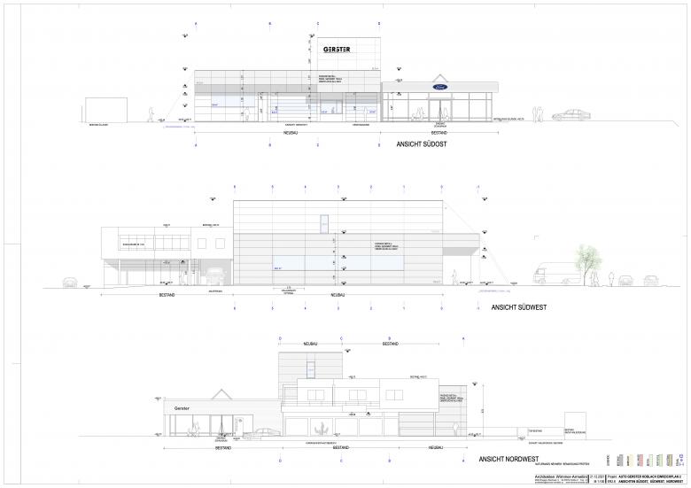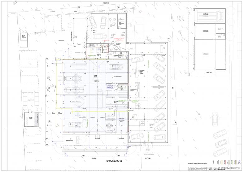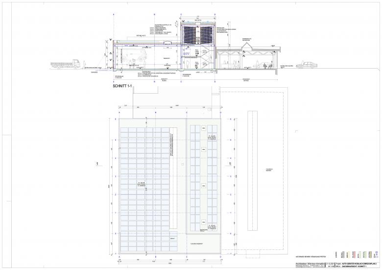 Bestehend sind 2 Gebäude, im Westen ein Schauraum mit Autowerkstatt inkl Nebenräumen, Lagern sowie im Osten ein Gebäude mit Aufbereitung, Waschanlage und Technikraum. Die bestehende Autowerkstatt samt Teilelager wird abgebrochen und mit allen notwendigen Nebenräumen und Lagern neu aufgebaut. im EG entsteht eine neue Autowerkstatt mit 8 Arbeitsplätzen, Werkstattbüro, einer Direktannahme sowie einem Teilelager. Im 1.OG wird ein weiteres Teilelager untergebracht, im 2.+3.OG entsteht ein neues Reifenlager mit dynamischem Lagersystem. Der bestehende Schauraum wird nicht verändert, die Aufstellung der Autos im Freien wird neu gestaltet. Für den Neubau kommt eine Tiefgründung zur Ausführung. Die neue Werkstatthalle wird mit Stahlkonstruktion und Verkleidung aus Alupaneelen in heller Farbe konstruiert. Das Dach wird extensiv begrünt und eine Photovoltaik-Anlage wird darauf neu installiert.