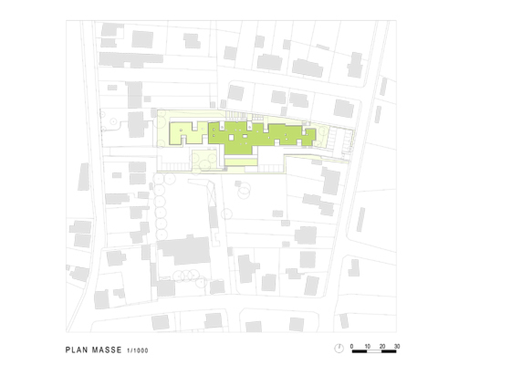 This retirement home is located on the heights of Riedisheim (a suburb of Mulhouse), in a residential neighborhood. The conjunction of geophysical and regulatory constraints rendered this plot of land difficult to build upon : its elongated form, its gradient exceeding 10%, and the very restrictive POS regulations applicable to it were a priori incompatible with the size and demands of the project. These conditions led us to develop the entire project within a construction adopted to the form and constraints of the land. The building unfolds in length from east to west, while its height, made of up of four trays slightly shifting away from one another, follows the natural slope. The roofs, visible from the principal access road located at the top of the plot, are all planted, which helped dampen the impact of construction in the neighborhood.