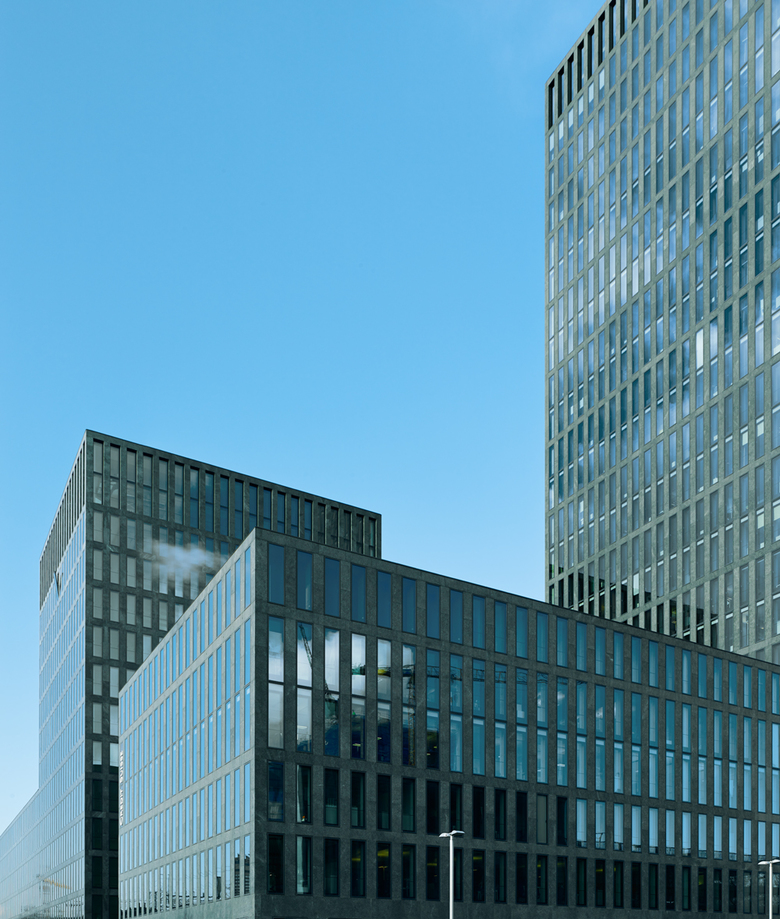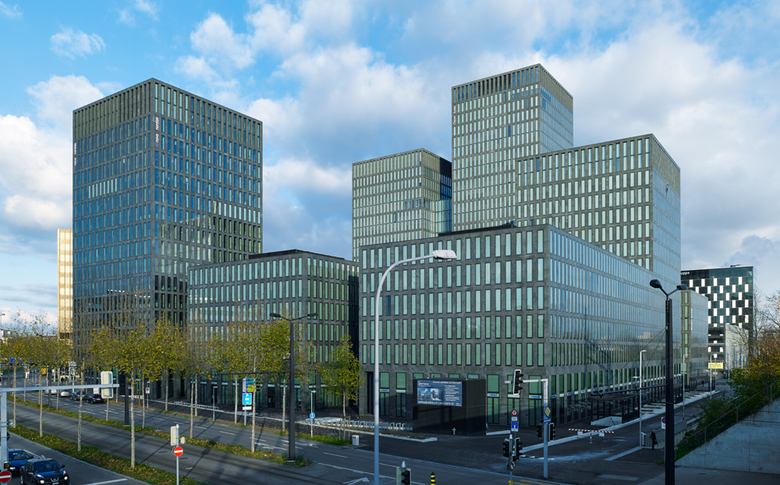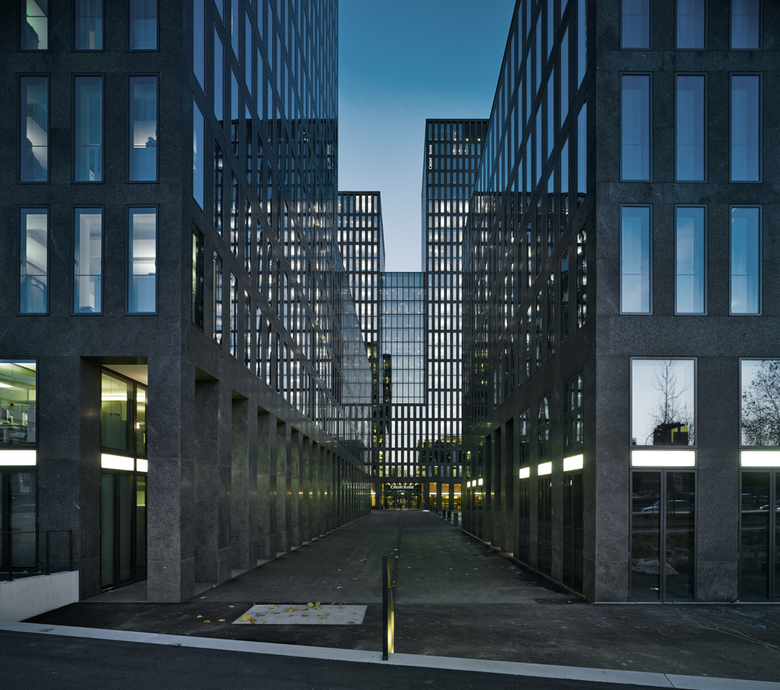 Auf einem rechtwinkligen Areal in Zürich-Nord, in der Nachbarschaft zum Hallenstadion und der Messe Oerlikon, sind vier Bürotürme entstanden – ein Doppelturmhochhaus und zwei einzelne Hochhäuser – die sich um einen zentralen Platz gruppieren.