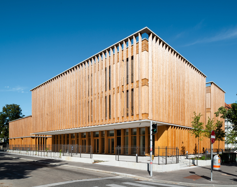 Städtebau – Besondere Sorgfalt galt der Definition und Integration des Bauköpers in die bestehende städtebauliche Situation. Der Neubau orientiert sich an den bestehenden Traufhöhen der Nachbarliegenschaften an der Peter-Jordan-Straße. Wenige, präzise gewählte Eingriffe gliedern den Baukörper. Baukörper Der Neubau reagiert in seiner Maßstäblichkeit angemessen auf seine Umgebung. Es ist eine grundlegende Entscheidung des Entwurfs, das oberirdisch errichtete Volumen (54% BRI) baurechtlich nicht maximal auszunutzen sondern möglichst viele Nutzungen unterirdisch (46% BRI) anzuordnen. Ein eingeschnittener Patio schafft belichtete Flächen im ersten Untergeschoss. Dadurch wurde bewusst auf die Errichtung eines Staffelgeschoßes verzichtet und so auch die Möglichkeit einer späteren Erweiterung geschaffen. Trotz der Widmung in zwei unterschiedliche Trakttiefen und zwei unterschiedliche Gebäudehöhen tritt das Gebäude durch die gewählten Fluchten als ein Baukörper in Erscheinung. Fassade Die vertikalen Holzlamellen und die horizontalen Bänder ändern das Erscheinungsbild des Gebäudes je nach Blickwinkel von Durchlässig bis zu Plastisch-Kompakt. Das umhüllende Lamellenwerk betont in seiner formalen Selbständigkeit den solitären Charakter einer signifikanten Architektur. Es bindet aber auch die beiden volumetrisch sehr unterschiedlichen Gebäudeteile zusammen. Die öffentlichen Bereiche des Gebäudes werden durch Halbierung des Fassadenrasters der Lamellen betont und bilden einen transparenteren Sockel.