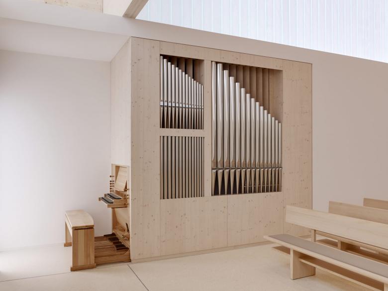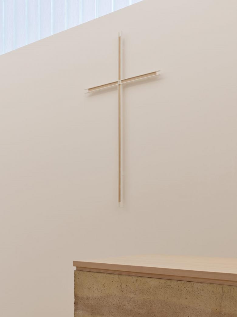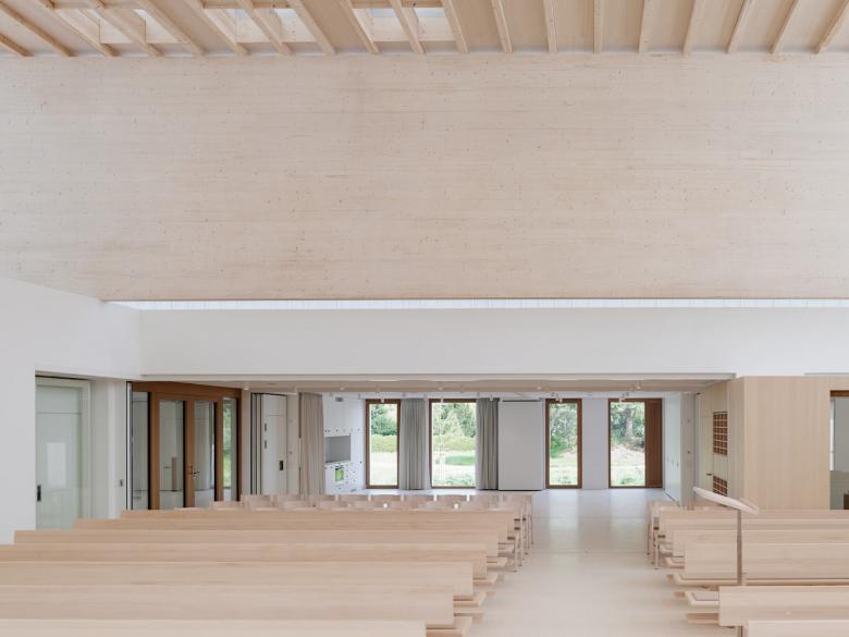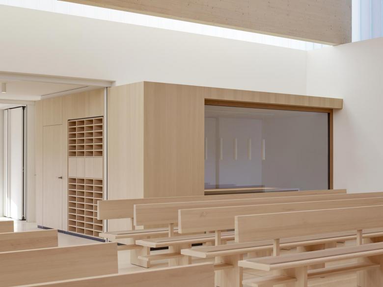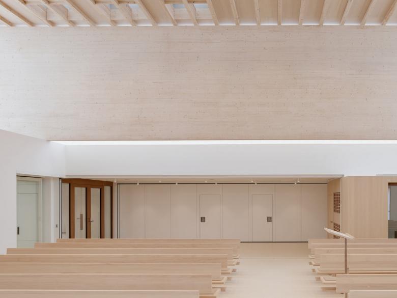 Der Gottesdienstsaal bildet das Zentrum der Anlage. Baulich wird dies in einem klaren Erscheinungsbild durch den transluzenten Aufbau aus lichtstreuendem Profilbauglas, durch den der Saal seine transzendente Wirkung erfährt, auch nach außen hin verdeutlicht. Die Fassade dieses Lichtkubus, der bei Abendandachten in den Stadtraum hinein leuchtet, erscheint je nach Blickwinkel und Lichtverhältnissen mal flächig glänzend, mal zart und filigran strukturiert. Das scheibenförmige Holztragwerk und die Beschränkung auf wenige Materialien tragen zu einer transzendierenden, hellen, ruhigen Raumwirkung bei. Von jedem Platz aus ist baulich ein uneingeschränkter Blick zum Altar gegeben, auch bei einer partiellen Erweiterung um das Foyer oder die Mehrzweckräume. Das Eingangsfoyer mit Garderobe, Brieffächern und Toiletten funktioniert unabhängig, sodass alle organisatorischen und damit die Stille und Konzentration störenden Tätigkeiten vor dem Betreten des sakralen Bereichs erledigt werden können.