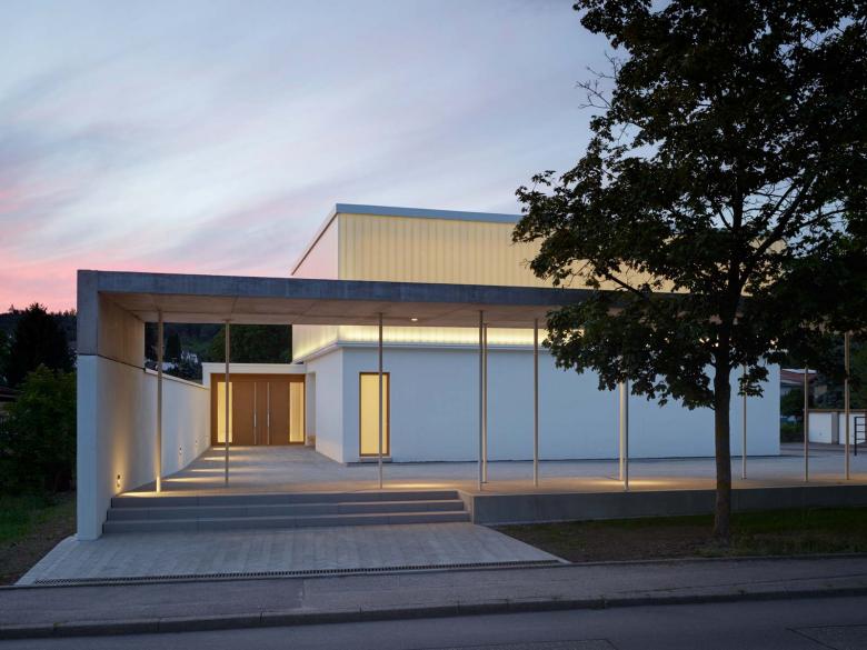Durch die Anordnung der Parkplätze im von der Straße aus nicht einsehbaren hinteren, tiefergelegenen Bereich des Grundstücks rückt der Komplex ganz an den Kreisel. Der Vorplatz ist Teil einer subtilen Inszenierung eines schneckenförmig angelegten Weges vom Parkplatz in den Kirchenraum; Schritt für Schritt lässt der Besucher den Alltag hinter sich, wird ruhiger, kann sich sammeln, begibt sich in die Geborgenheit der Gemeinde und die Stille des Kirchensaales.