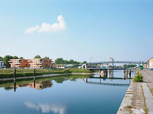 Die beiden Wohngebäude im Konversionsgebiet auf der Ludwigshafener Parkinsel nahe des Rheins sind als viergeschossige Punkthäuser mit zentraler Erschließung organisiert. Zwei bis vier Wohnungen werden über einen lichten Hof mit Treppe und Aufzug erschlossen, zwischen den geplanten Neubauten liegt der leicht erhöhte Eingangsplatz.