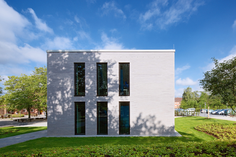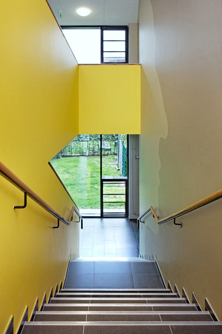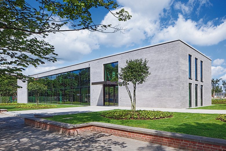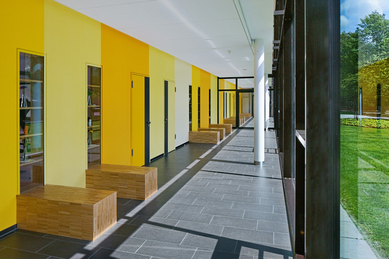 Der 2-geschossige Neubau nimmt die Formensprache des Architekten Rudolf Schroeders auf. Die zum Schulhof geöffnete Fassade ermöglicht eine gute Sicht auf den Altbau, der sich in der neuen Glasfassade spiegelt. Die horizontalen Erschließungen dienen zugleich als Kommunikationsbereiche für die Schüler. Direkt an der Glasfassade beziehen sie das Leben auf dem Schulhof mit ein. Die Klassenräume sind nach Norden ausgerichtet.