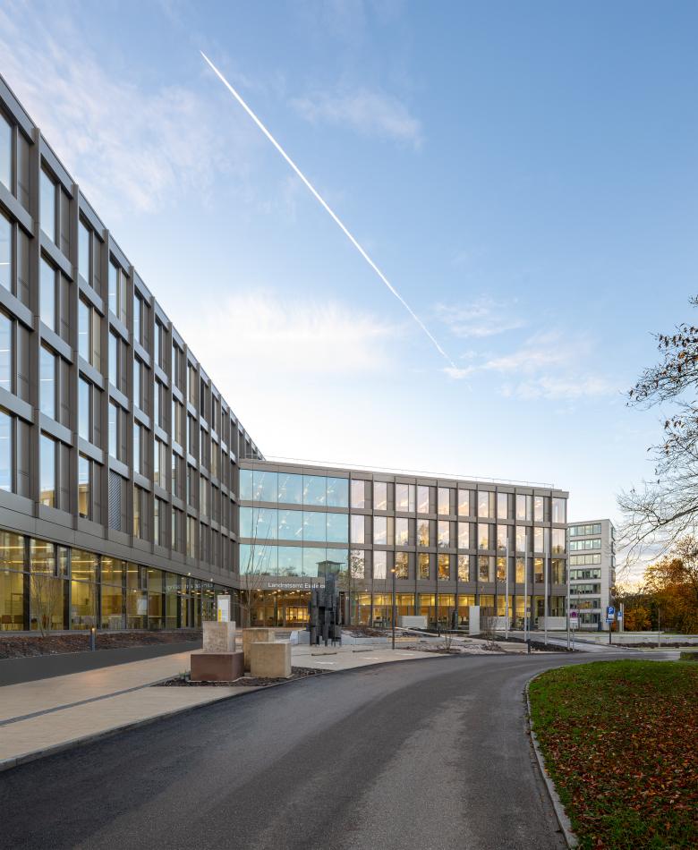 Der Neubau des Landratsamtes präsentiert sich als hochfunktionales Verwaltungsgebäude, das mit insgesamt 675 Arbeitsplätzen, 45 Beratungs- und Besprechungsräumen, sowie vielfältigen Funktionsräumen ein breites Spektrum öffentlicher und interner Arbeitsprozesse ermöglicht.