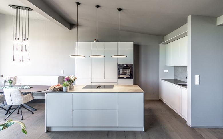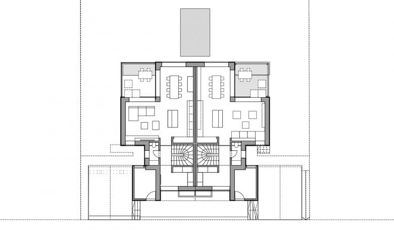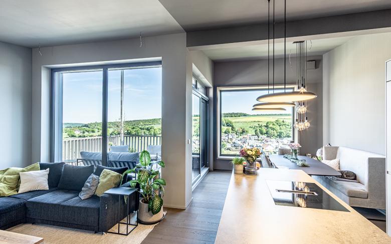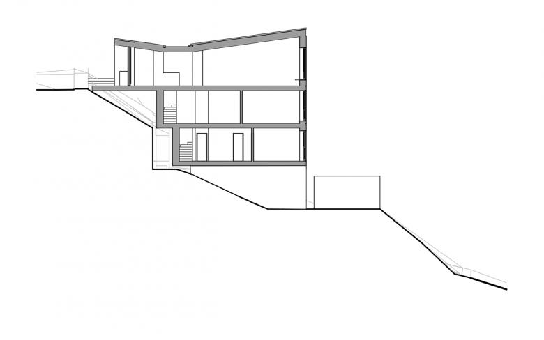 Von der Straße aus kaum sichtbar, entfaltet sich das Haus über drei Ebenen am 45° steilen Hang. Das Wohngeschoss auf der Straßenebene bietet, fast schon erhaben, einen Blick über den Ort und die sanften Hügel des Taunus. Die Terrasse fungiert als Aussichtsplattform, und auch die übrigen Zimmer genießen diesen außergewöhnlichen Ausblick.