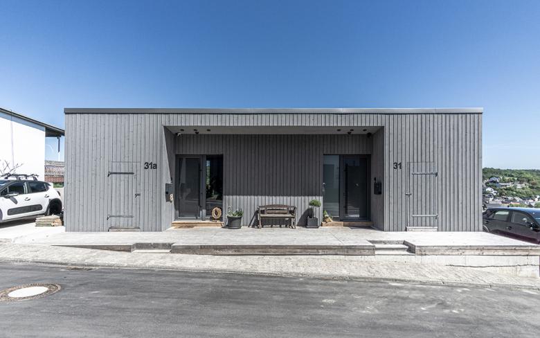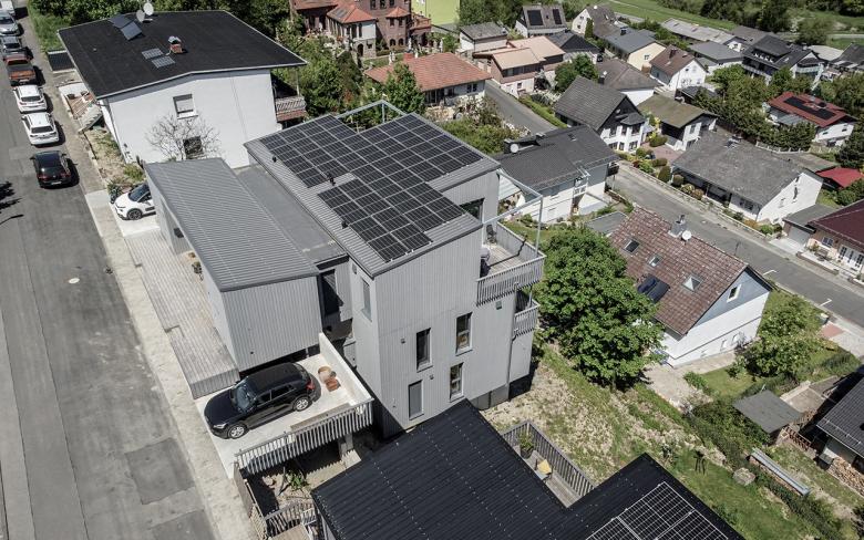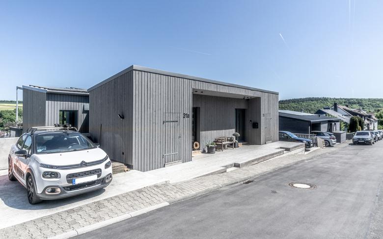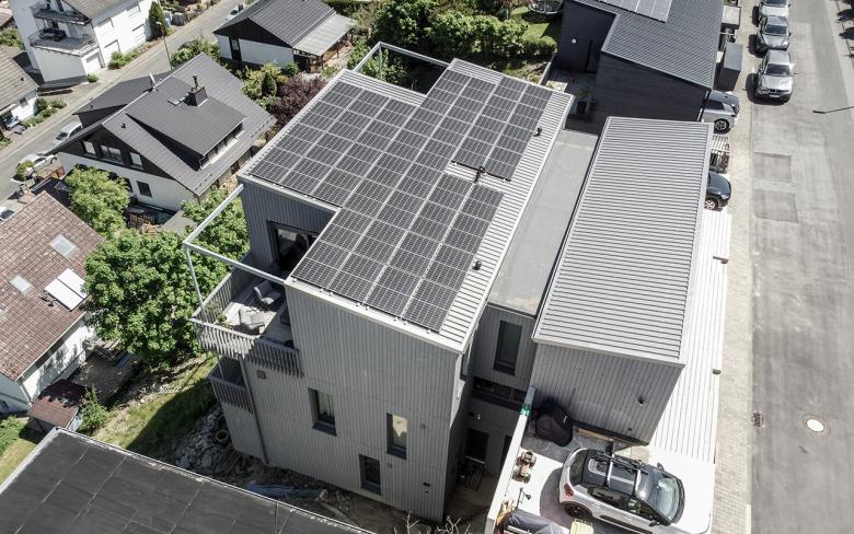 Holzständerbauweise mit Wärmepumpe, dezentraler Lüftungsanlage mit WRG und PV-auf dem Dach.