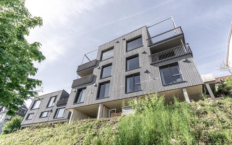 Die Fassade des Hauses ist hell und vorvergraut, was einen markanten Kontrast zu unserem schwarzen Nachbarhaus bildet.