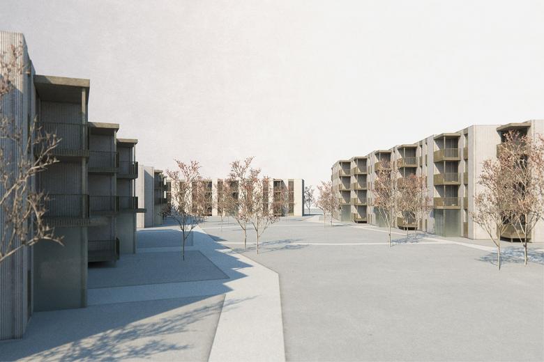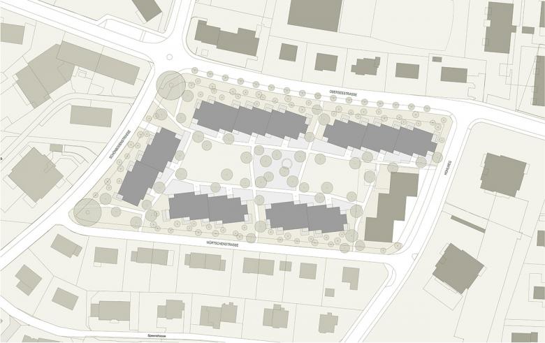 Die Wohnüberbauung nimmt die Kleinteiligkeit ihrer gewachsenen Nachbarschaft auf und spannt zugleich einen in seiner Ausdehnung markanten Aussenraum auf. Mit einer lebendigen Mitte, die innerhalb seiner Nachbarschaft Identität und Adresse schafft. Sie besetzt dazu das Grundstück entlang der Ränder und gibt in ihrer Mitte den grosszügigen und zugleich baulich eingefassten Grünraum frei. Mit ihren zu den Strassenkreuzungen hin offenen Ecken und den jeweils in Längsrichtung gestaffelten Abwicklungen der einzelnen Gebäudezeilen vermeidet die Überbauung den Massstabsbruch der geschlossenen Grossform innerhalb ihrer dispers bebauten Umgebung.