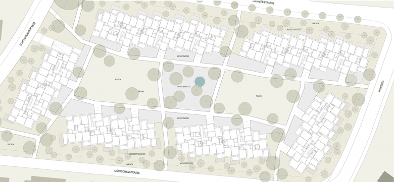 Entlang der Hoffassaden entsteht ein umlaufender, den Häusern vorgelagerter Kiesstreifen. Als Vorzone erlaubt er den Erdgeschossbewohnern, von ihren Loggien hinab zu treten und «ihren» Bereich für sich zu bespielen. Jenseits dieser Distanzstreifen entlang seiner Wände wird der Hof in 3 grosse Felder unterteilt, von denen die beiden im Westen bzw. im Osten liegenden als Spielrasenflächen angelegt sind. Das mittige Feld ist als Kiesplatz mit Wasserstelle, Bänken und Spielgeräten möbliert. Aussen herum wird die als Vorgarten des Gevierts angelegte Wiese mit mehrstämmigen Grosssträuchern bepflanzt. Weil sich sämtliche Gebäudezugänge allein auf den Hof orientieren, bleibt diese Wiesenfläche als Vorgarten den EG-Bewohnern vorbehalten. Analog zur Hofseite wird vor den Loggien der Wohnungen je ein kleiner Kiesplatz angelegt und vom Hochparterre aus über Treppchen erreicht. An den Durchgängen von der Strasse her in den Hof begleiten lichte Baumarten die Wege ins Innere der Überbauung. Dort breiten sich die Bäume in der Fläche aus und spenden auf Rasen und Quartiersplatz im Sommer Schatten.