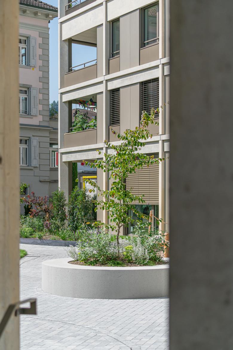 Zur Strasse im Norden befindet sich ein breiter Eingangsbereich für die öffentliche Nutzung. Nordwestlich und östlich des Wohnhauses bilden sich zwei offene Plätze. Der eine enthält einen Aufenthaltsbereich und einen Spielplatz für die Bewohner. Der andere Platz bildet einen offenen Begegnungsplatz in der Nähe des Einganges für das Wohnhaus. Das denkmalgeschützte Polizeipostengebäude bildet den Abschluss des Areals. Zwischen den zwei Gebäuden entsteht ein privater Aussenraum für die Bewohner.