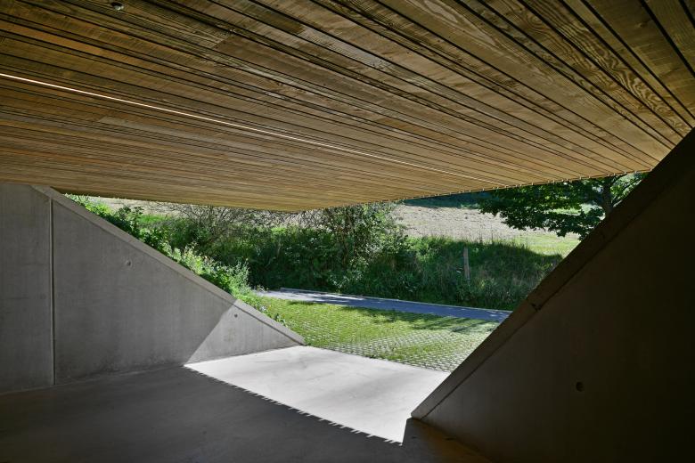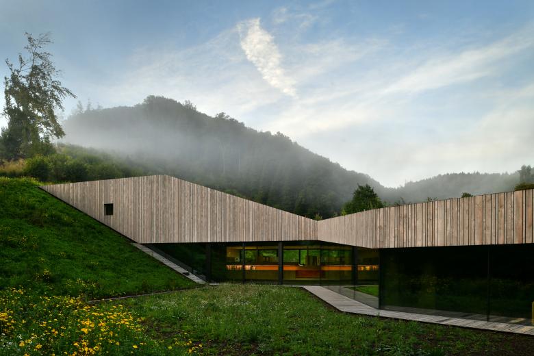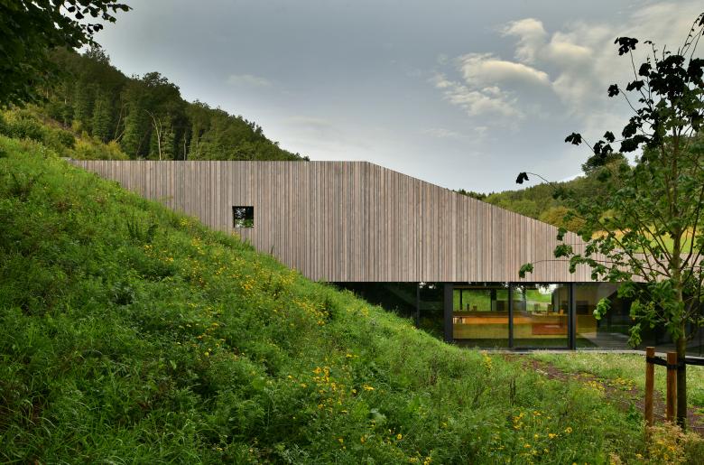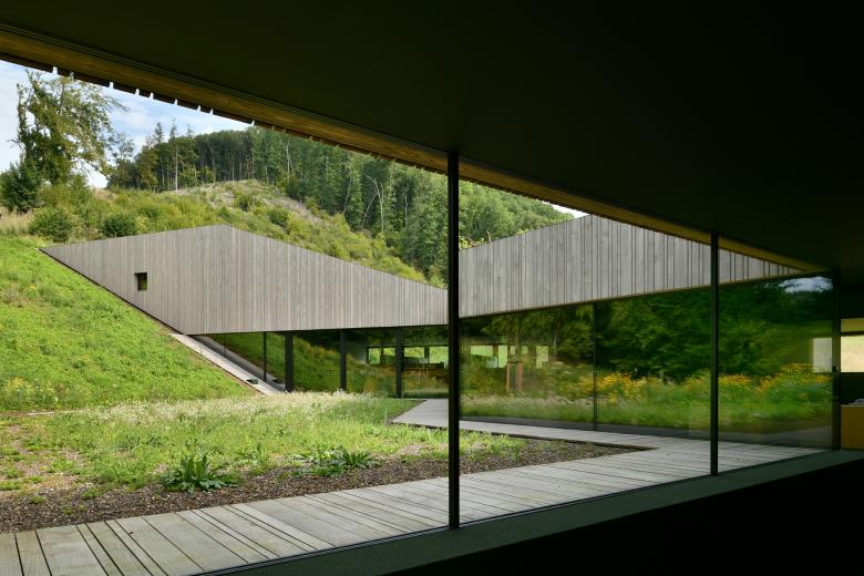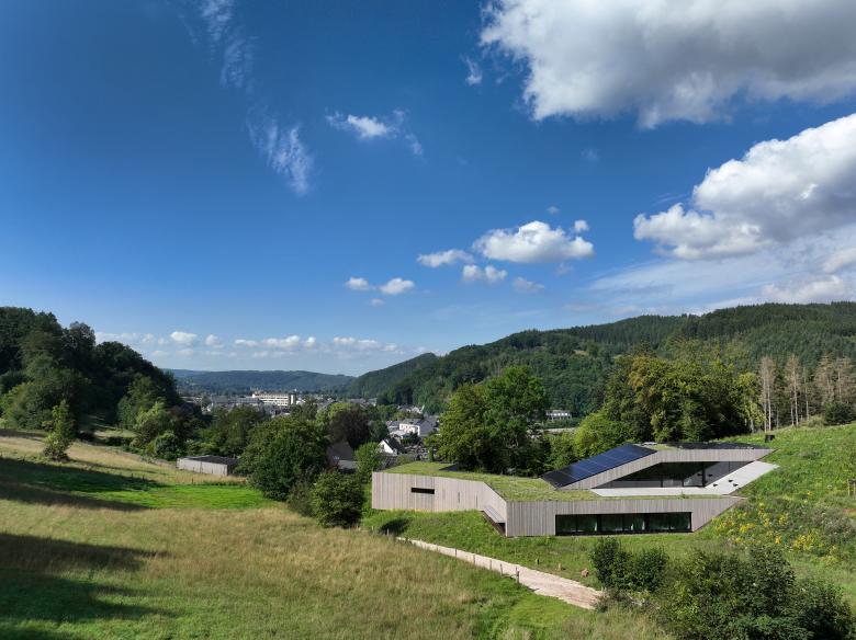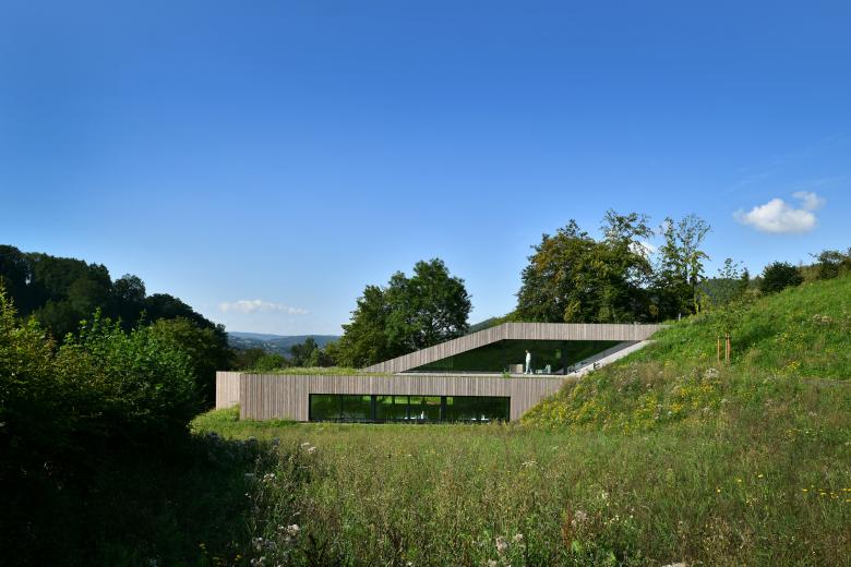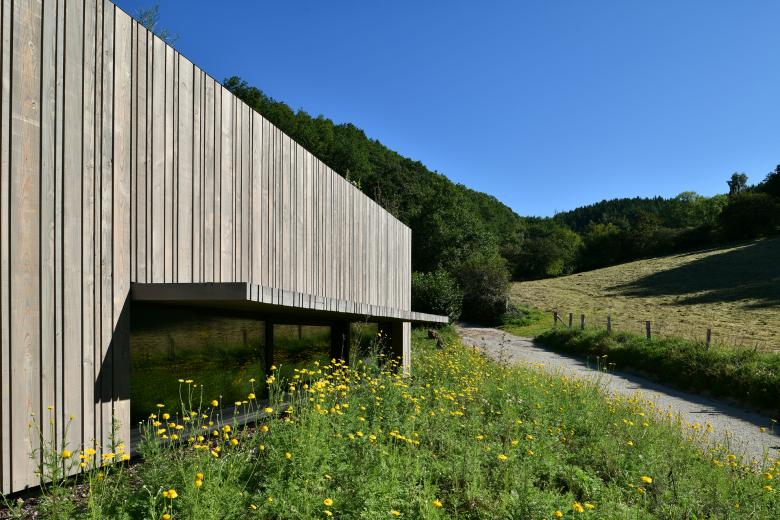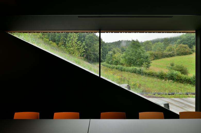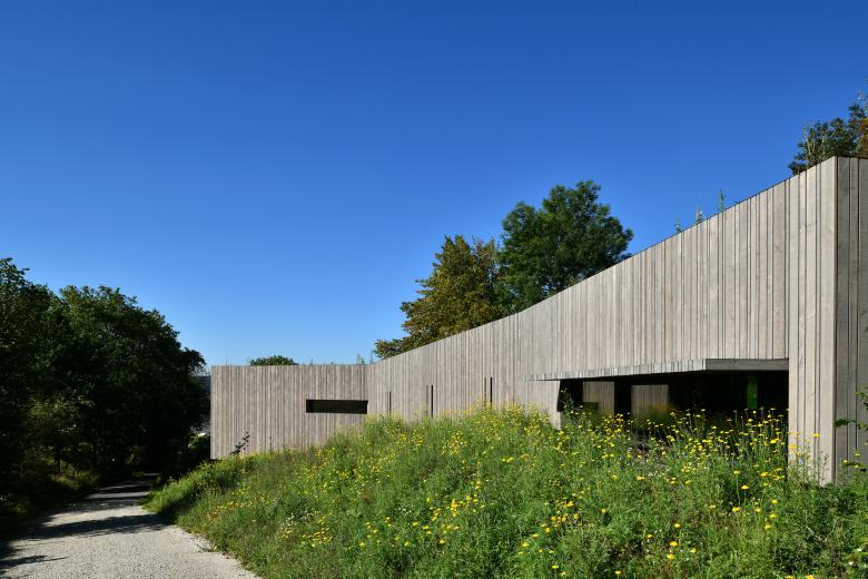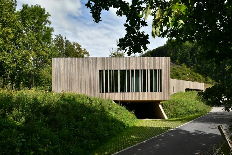 Afin de minimiser au maximum son impact visuel, le bâtiment s'enfonce dans le terrain aussi bien verticalement dans le sol qu'horizontalement dans la colline permettant ainsi un impact limité malgré une programmation importante. Cette intégration est accentuée par le parement bois ton gris qui se fond dans l'environnement naturel et par la végétalisation complète des toitures plates.
