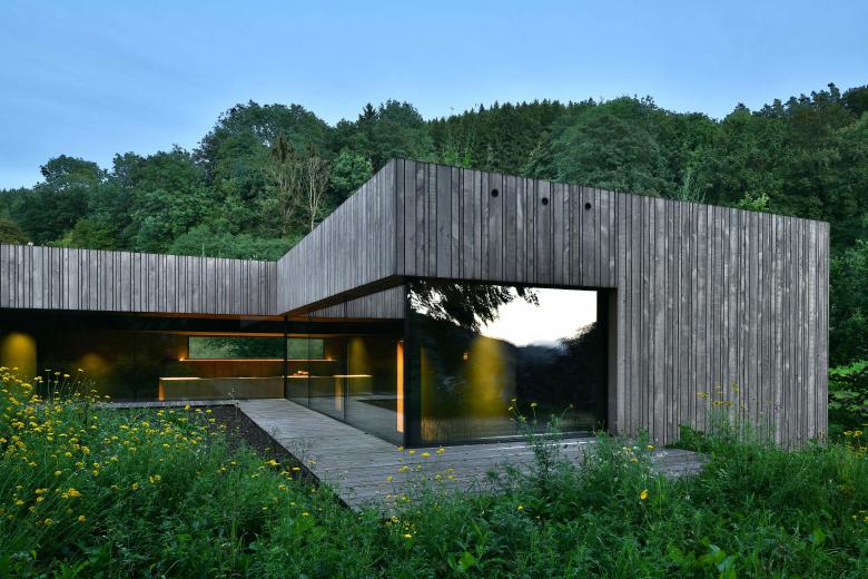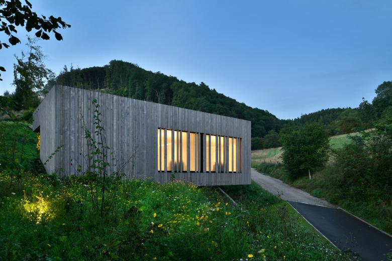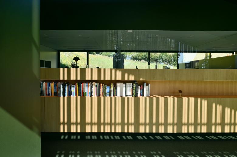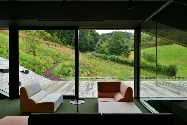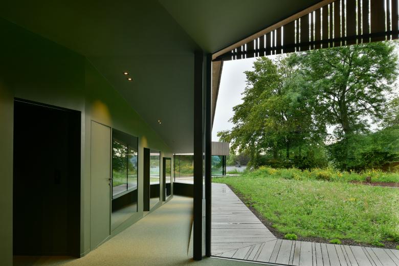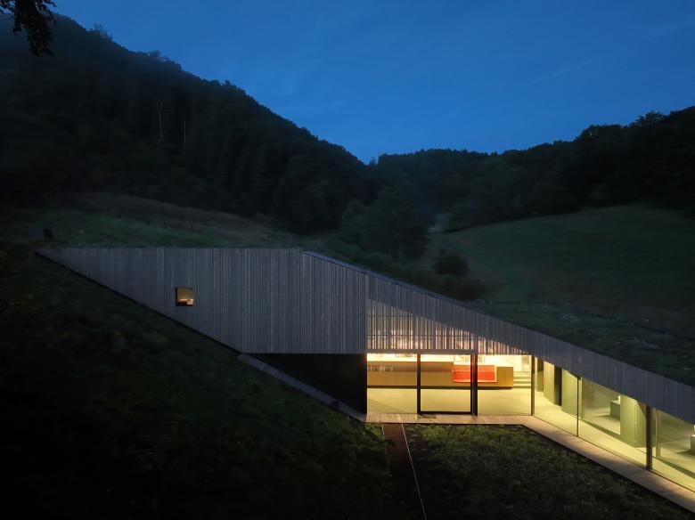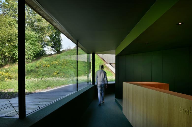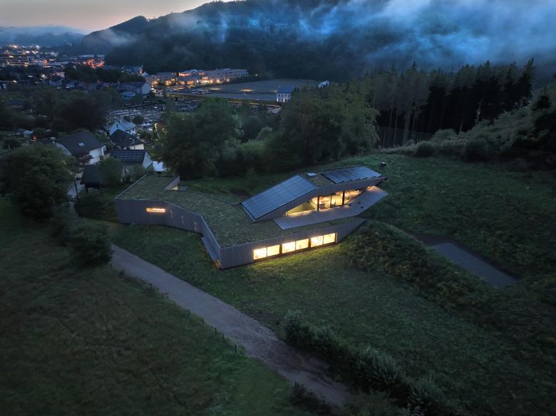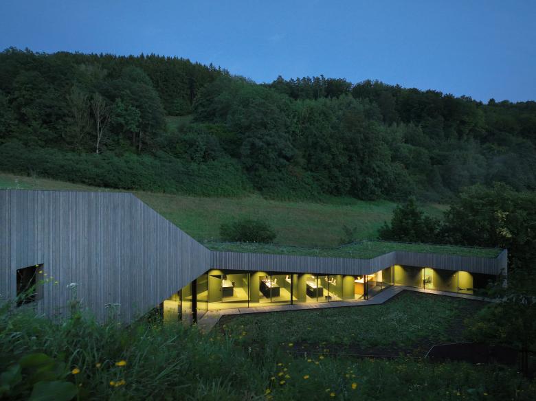 Afin de minimiser au maximum son impact visuel, le bâtiment s'enfonce dans le terrain aussi bien verticalement dans le sol qu'horizontalement dans la colline permettant ainsi un impact limité malgré une programmation importante. Cette intégration est accentuée par le parement bois ton gris qui se fond dans l'environnement naturel et par la végétalisation complète des toitures plates.